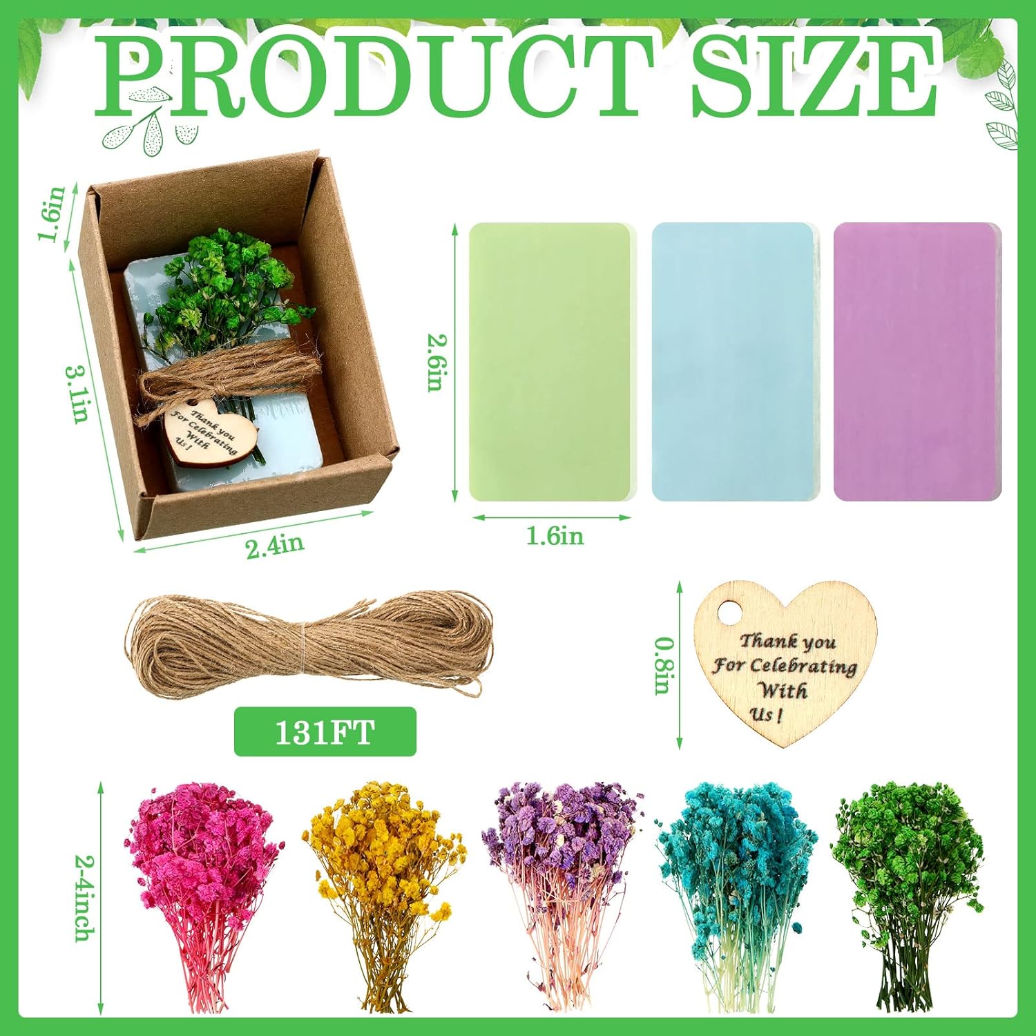 • Enough to Meet Your Needs: you will receive 45 pieces of baby shower soap favors in blue, green and yellow, 45 pieces of brown paper boxes with lids, 100 pieces of dried flowers with branches in pink, blue, yellow, purple and green, 1 roll of twine rope, 45 pieces of love shaped wooden labels, printed with words [thank you for celebrating with us; A complete and considerate combination to meet your various needs
