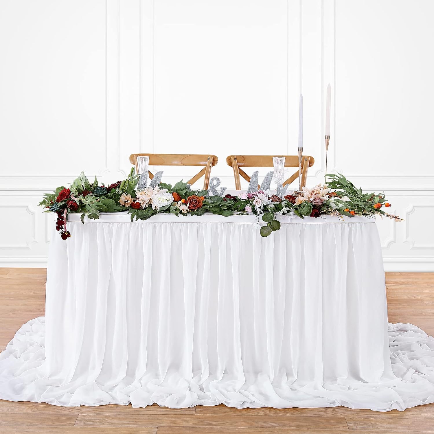 White Table Skirt for Rectangle Tables 14FT Chiffon Sheer Tablecloth for Birthday Party Sweetheart Cake Table Decoration