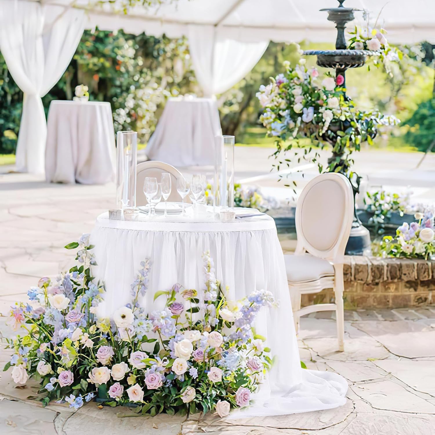 • 💡 White Table Skirt Material: The extra long chiffon table skirt is made of Sheer Chiffon which is wrinkle-free, soft, and with a nice drapery. Table skirt both robust for kids birthday party supplies and elegant if used for wedding decoration.