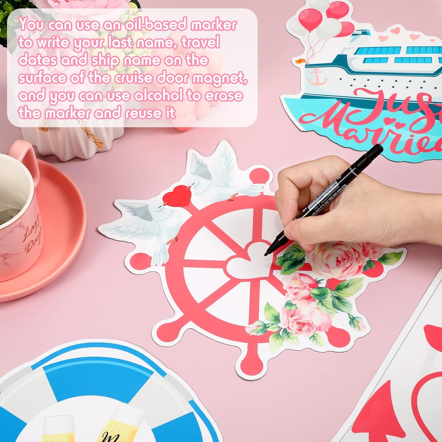 • Delicate and Romantic: these cruise ship door magnets are designed with romantic and exquisite patterns, like anchors, hearts, veil, life rings, wine glasses, rudders, birds, flowers, cruise ships and printed with the [just married] words, full of a warm and joyous atmosphere