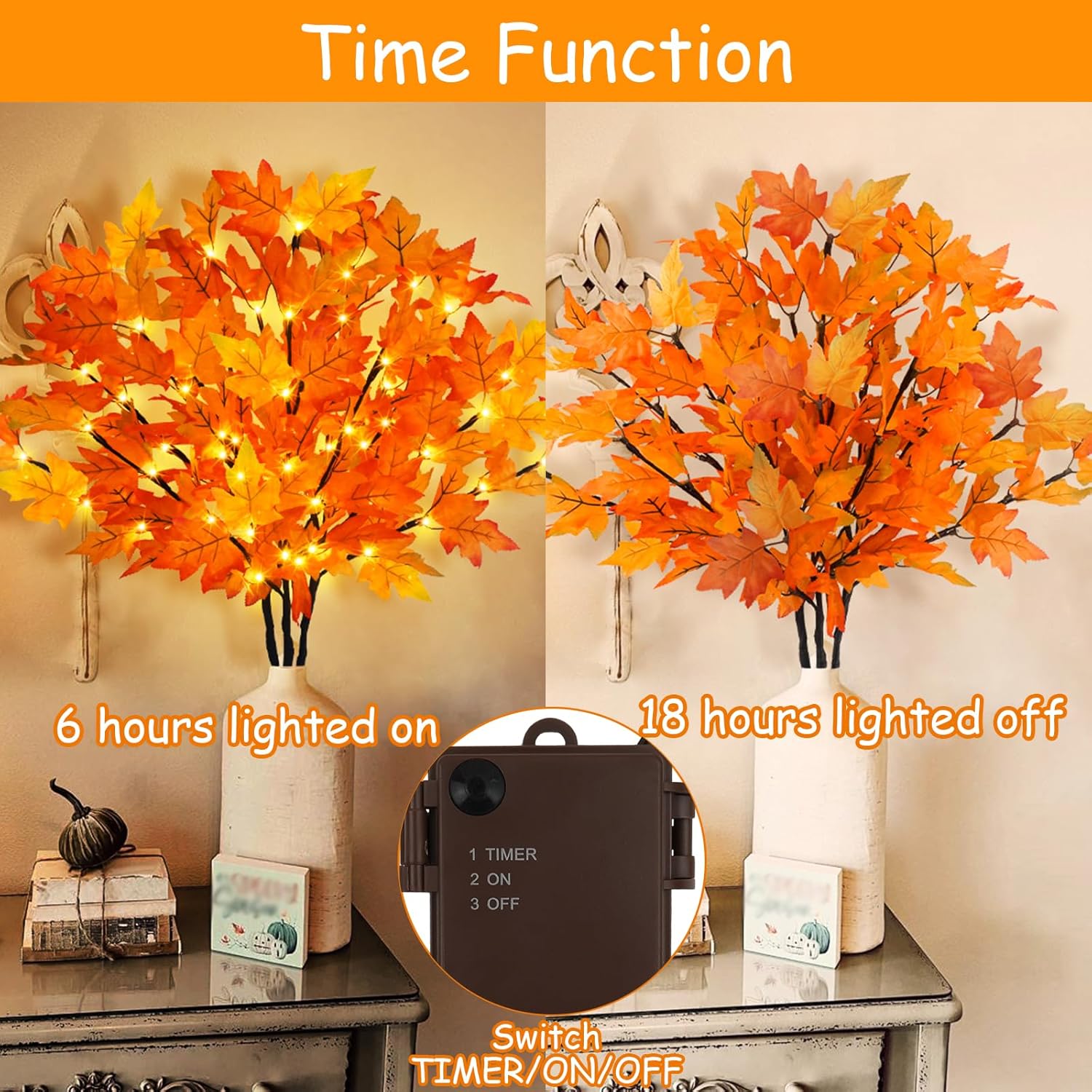 3Pcs 30”Lighted Maple Leaves Branches Stems with Timer Battery Operated 60 LEDs Fall Artificial Maple Branches with Lights for Vases Autumn Home Thanksgiving Halloween Christmas Decoration