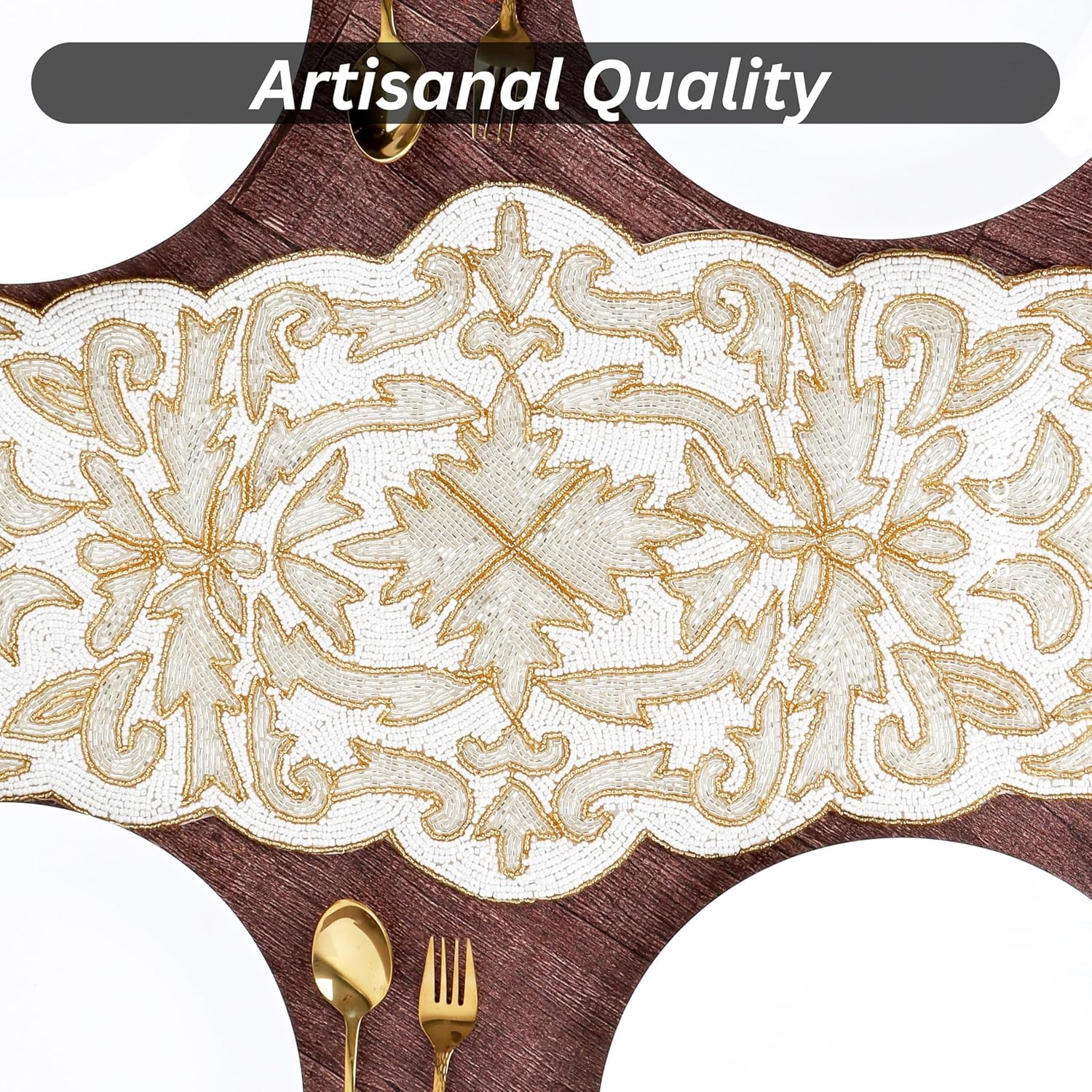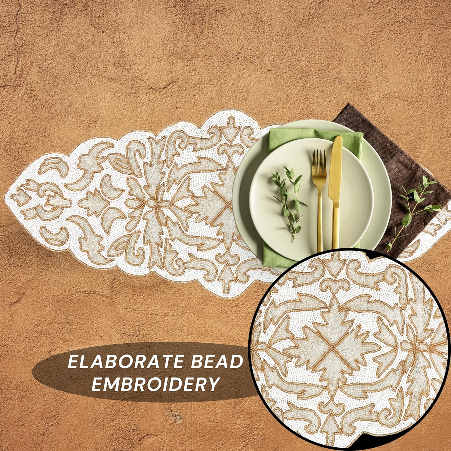 Beaded Table Runner 13 x 36 Inches - Elegant Dining Table Centerpiece with Glass Beads & Polyester Back, Handmade Decorative Runner for Weddings, Parties & Holiday Décor (White & Gold) - CLEENTABLE