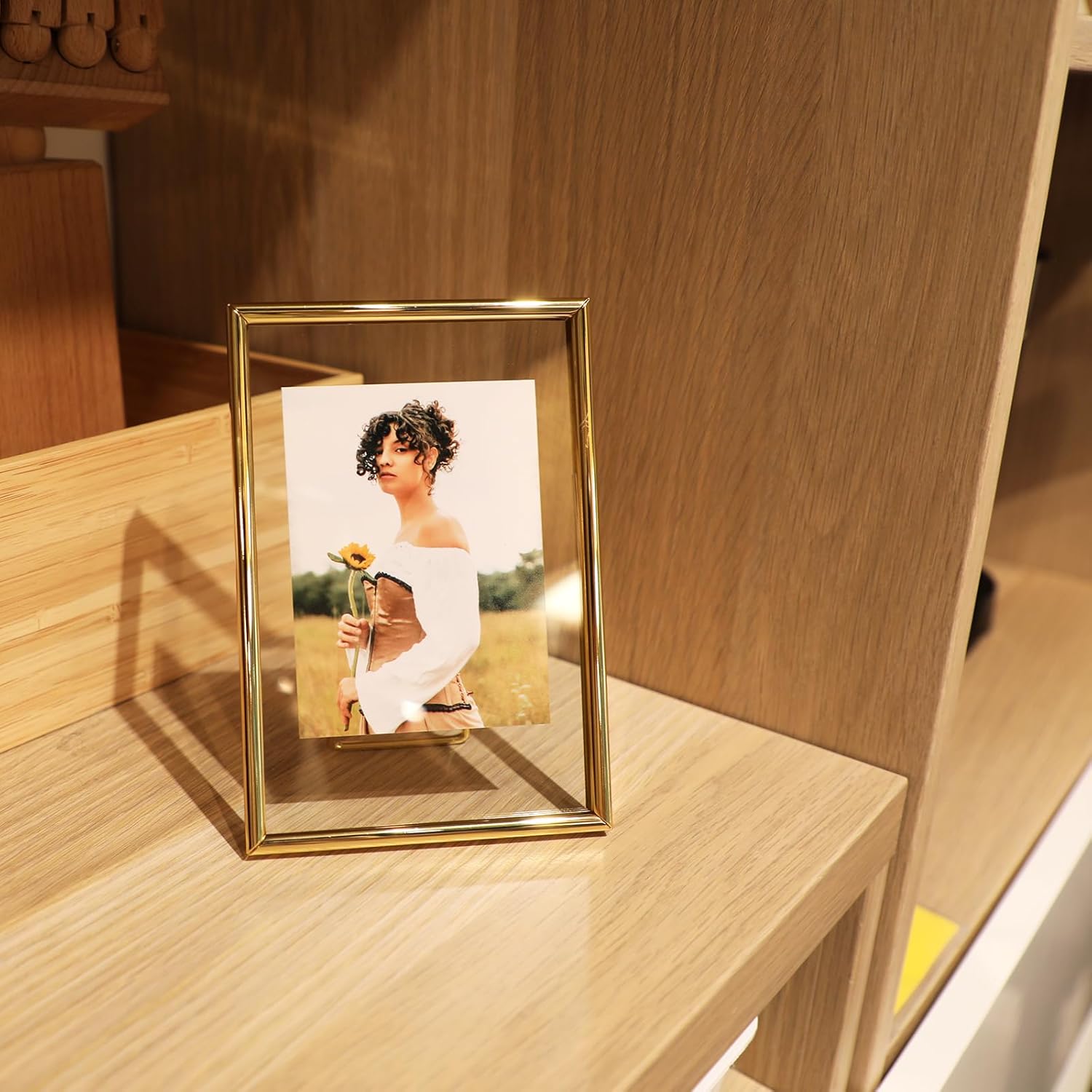 • 【Romantic Design】A gold metal frame with heart-shaped stand(Put you in my heart) and transparent glass, making it looks very romantic and elegant. It appears that the photo has a floating effect on it, So you can focus on the photo.