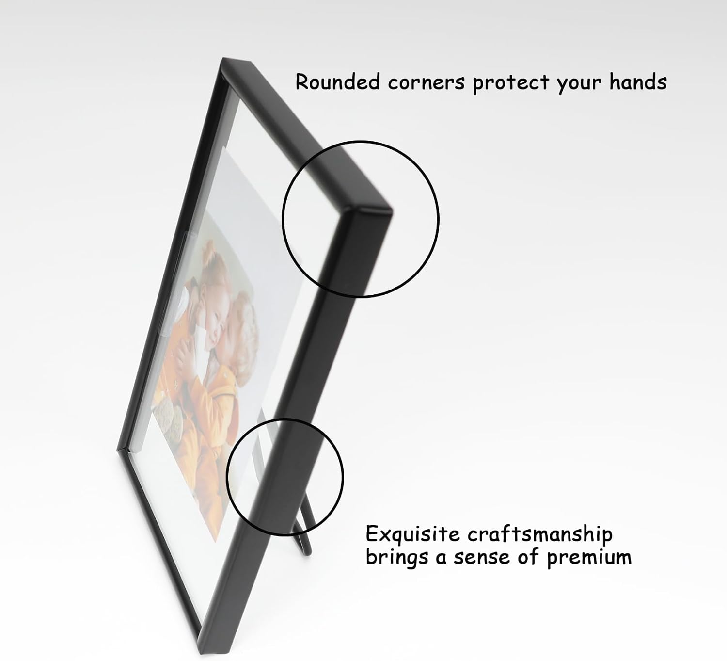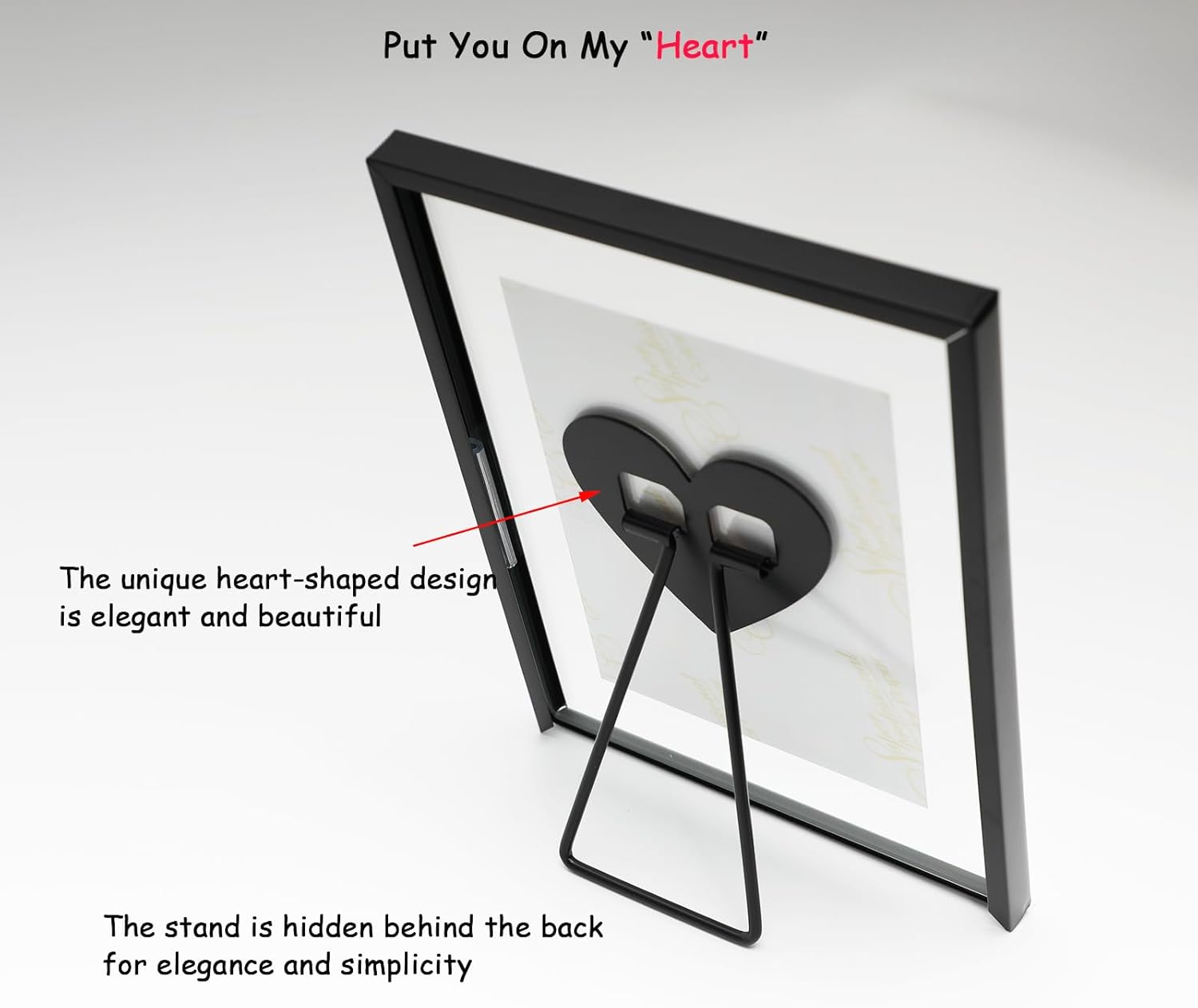 • 【Romantic Design】A black metal frame with heart-shaped stand(Put you in my heart) and transparent glass, making it looks very romantic and elegant. It appears that the photo has a floating effect on it, So you can focus on the photo.
