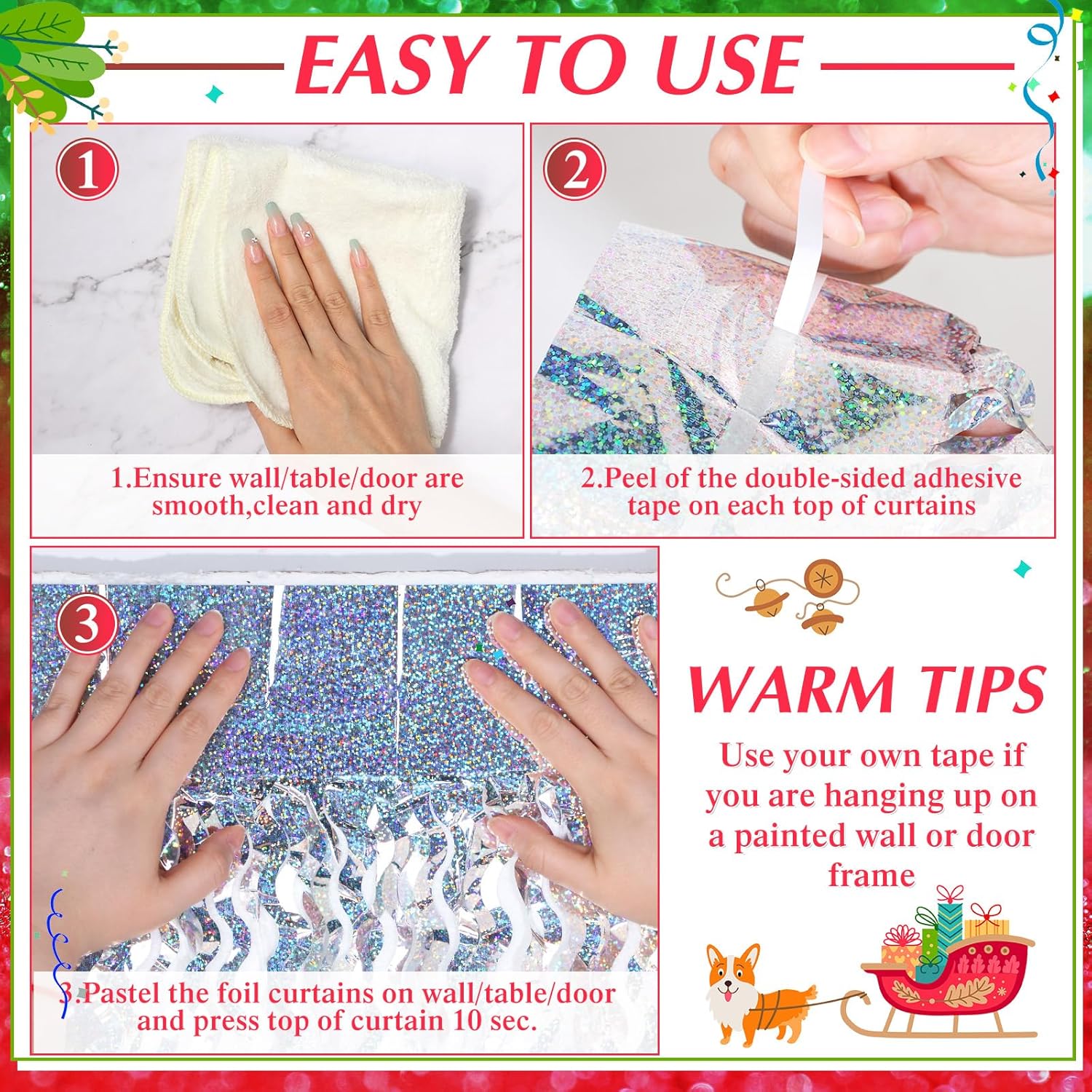 • Easy to Assemble: the tinsel curtain backdrop has a tape behind it for you to stick on decorative places such as walls, windows, tables and doors to create a silver world, full of romantic atmosphere, so that you and your partners can have fun, and you can take pictures for memory