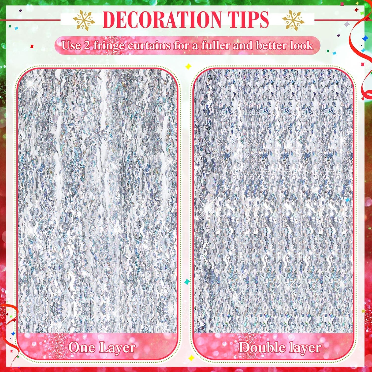 • Using Tips: metallic foil fringe backdrops are easy to cut, and you can cut the ribbon into desired width and length with scissors, and you can put multiple curtains side by side to make the background bigger or fold multiple curtains together to achieve a thicker effect, giving you better visual pleasure