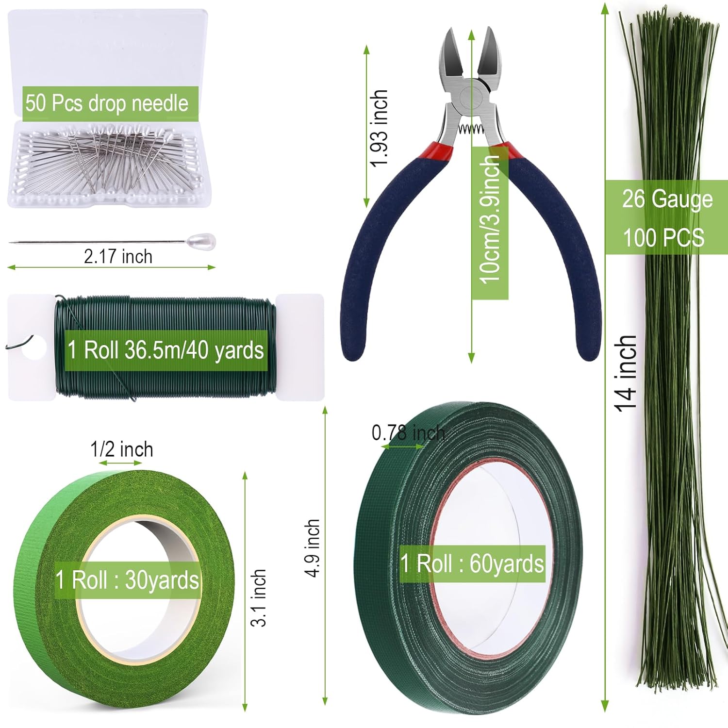 • Everything You Need: Our floral arrangement kit includes 100pcs of 26 gauge green stem wire, 40 yard 22 gauge green paddle wire, 4 rolls of different kind floral tape, 50pcs corsage boutonniere pins, and 1 pair of wire cutters. All the supplies you need for beautiful DIY flower arrangements!