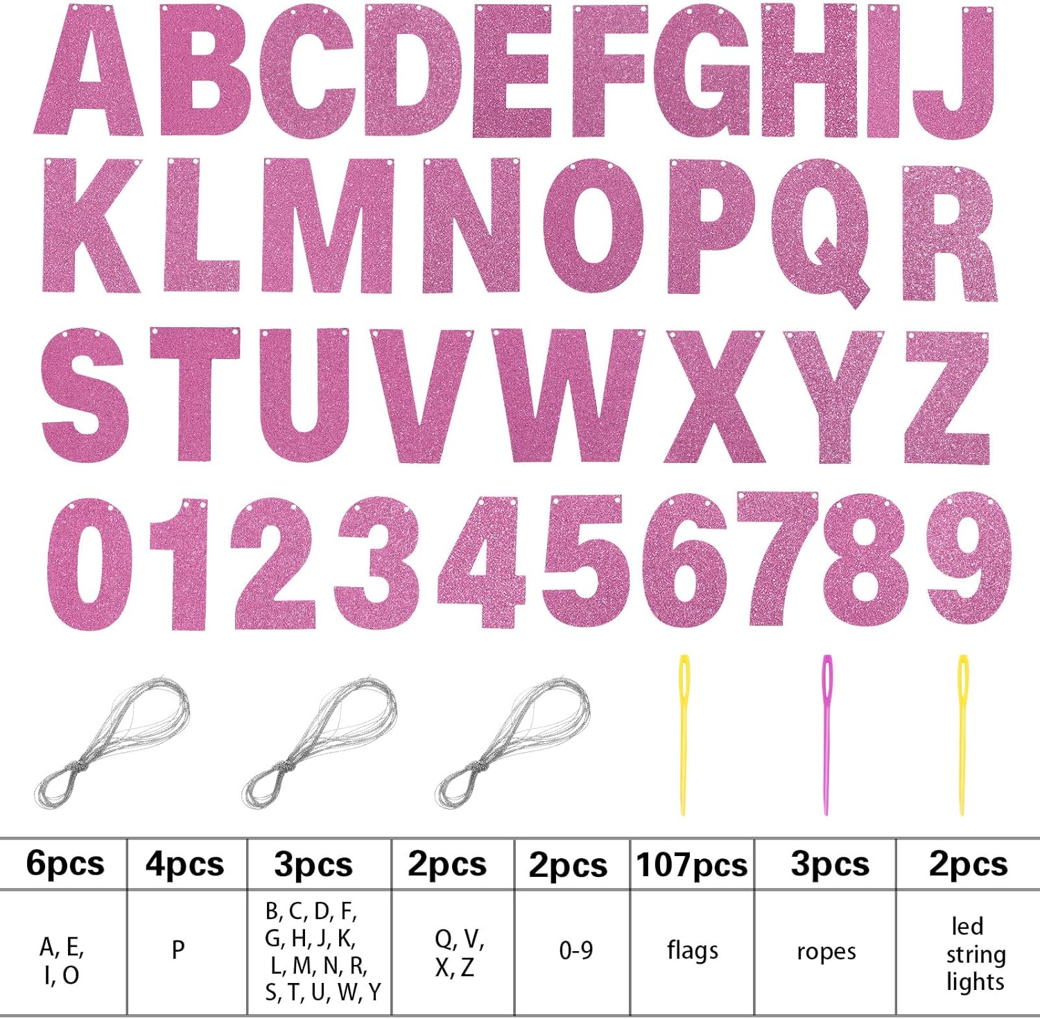 • DIY Banner Kit with Letters: you will get 107 pieces of letters and numbers, including 6 'A, E, I, O' letters, 4 'P' letters, 3 'B, C, D, G, H, J, K, L, letter M, N, R, S, T, U, letter W, Y, F shape' letters, 2 'Q, V, X, Z' letters and 2 '0-9' numbers, come with 3 ropes; Nice combination meet your various parties decorative demands