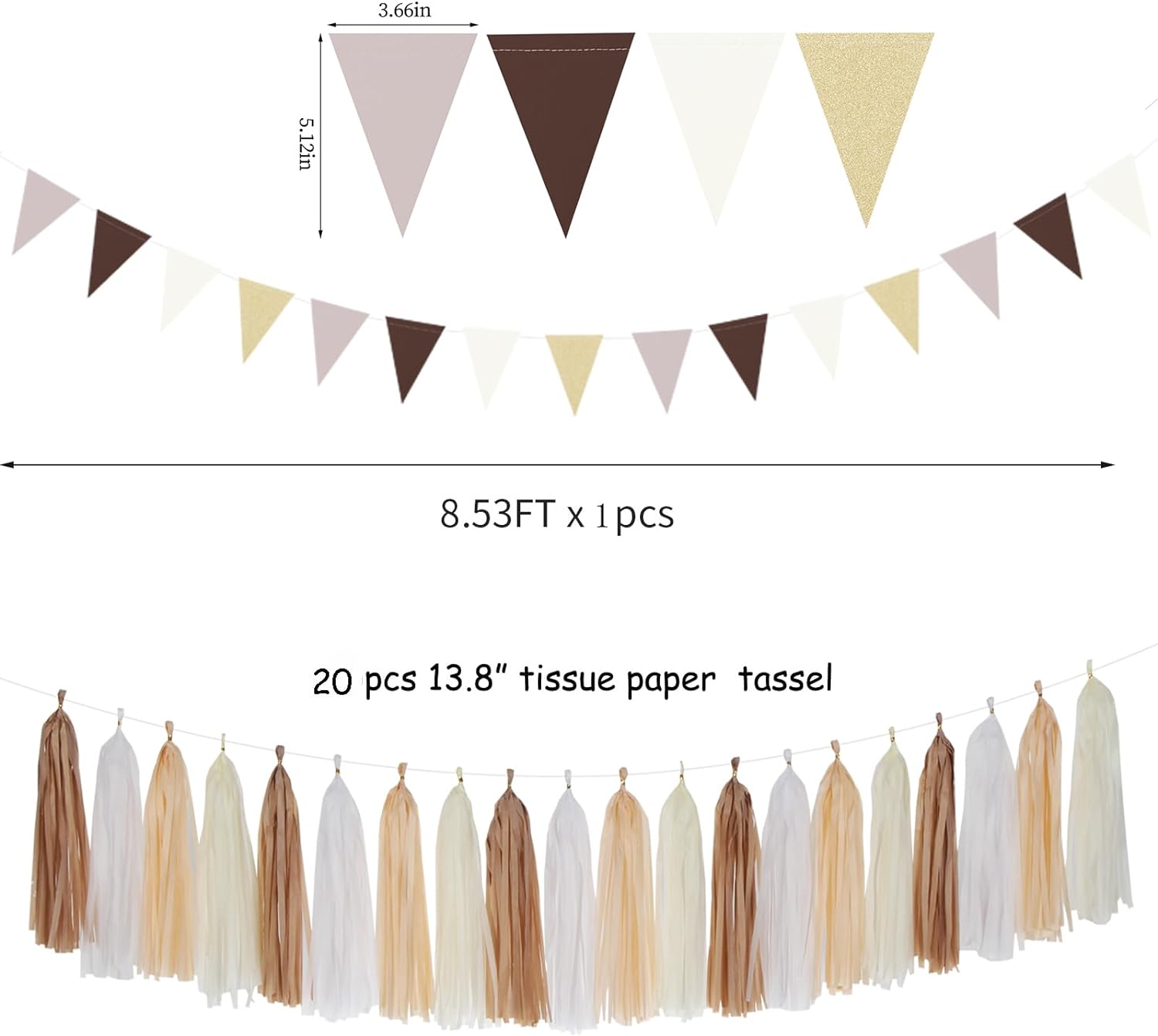 Boho Baby-Shower White-Brown Champagne Party-Decorations - 28pcs Neutral Birthday Wedding Bridal Tissue Pom Poms Streamers, Fall Autumn Tassel Garland Banner, Engagement Christmas Decor Ouruola