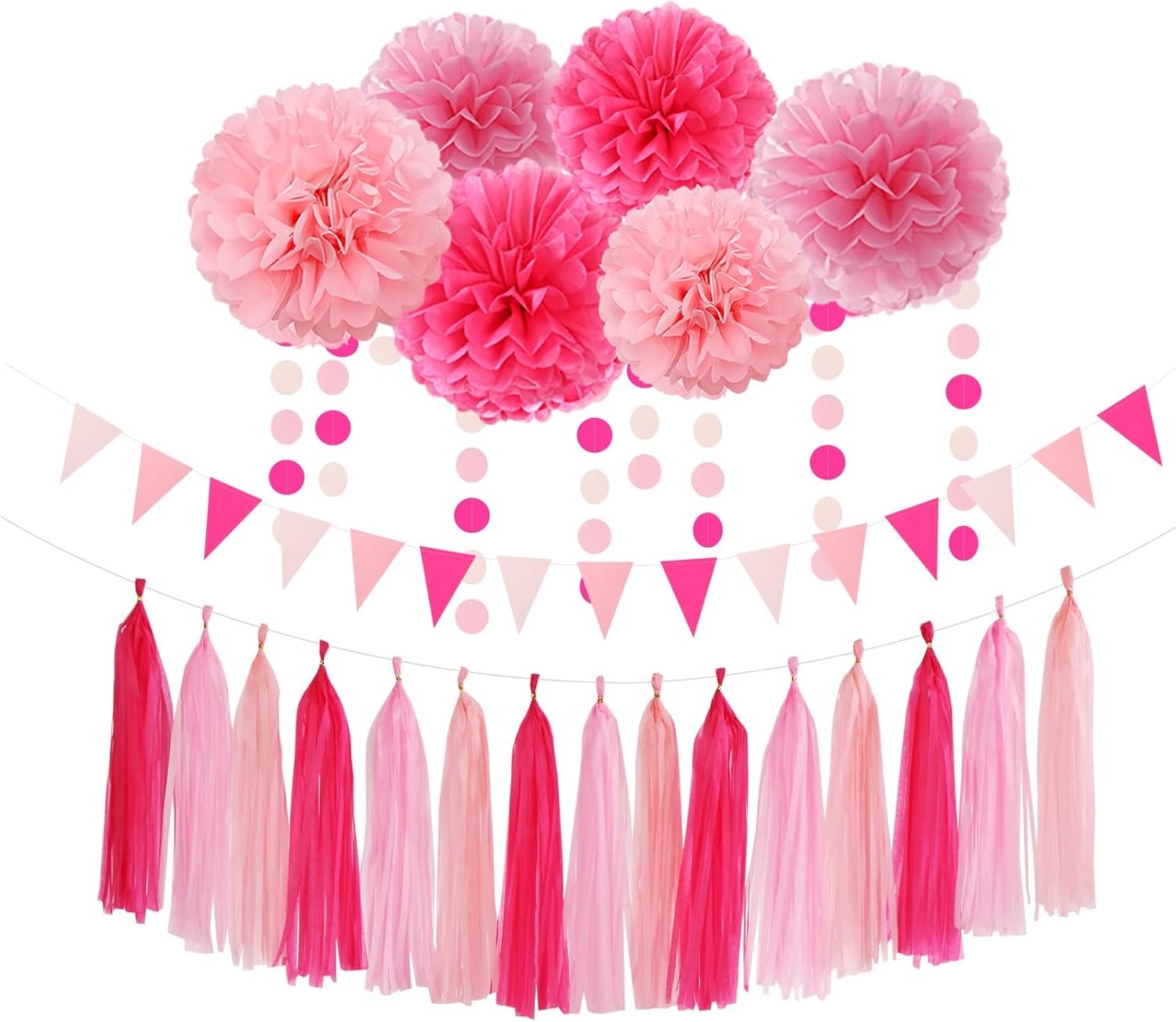 • 【Package Contains】The rose hot pink party kits include 6pcs tissue paper flowers: 3pcs 8" and 3pcs 10" in three color, 1pcs Triangle Flags,1pcs circle dots paper garland,15pcs tassel garland. Total 23pcs.