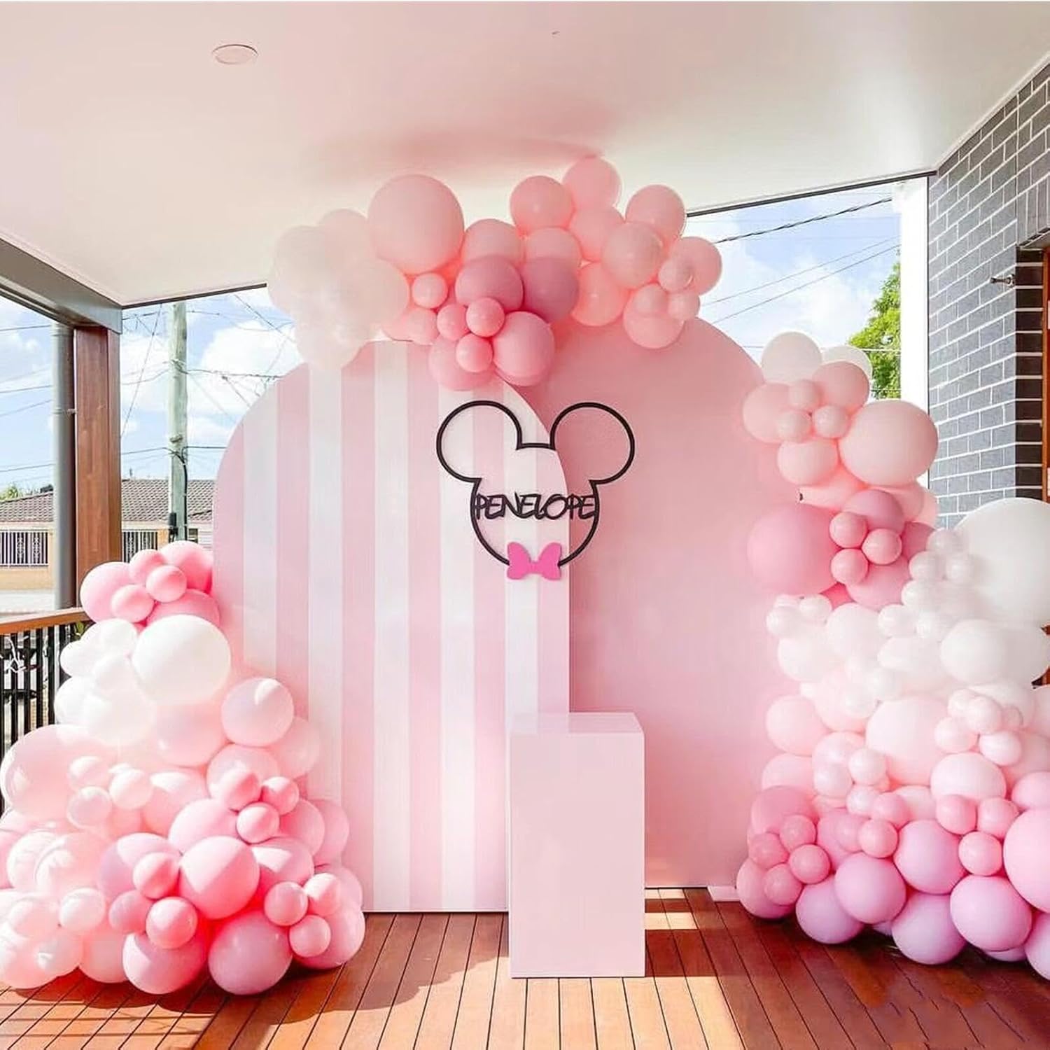 • PINK BALLOON ARCH GARLAND KIT: Includes 412 pastel pink Balloons, 18inch 12pcs, 12inch 100pcs, 10inch 100pcs, 5inch 200pcs , 2 rolls of Balloon glue point(200pcs), 2 rolls of balloon decoration strip(32.8 feet / 5m*2 with 220 holes), 2 roll of ribbon. plenty in quantity, perfect for making indoor or outdoor them decoration.