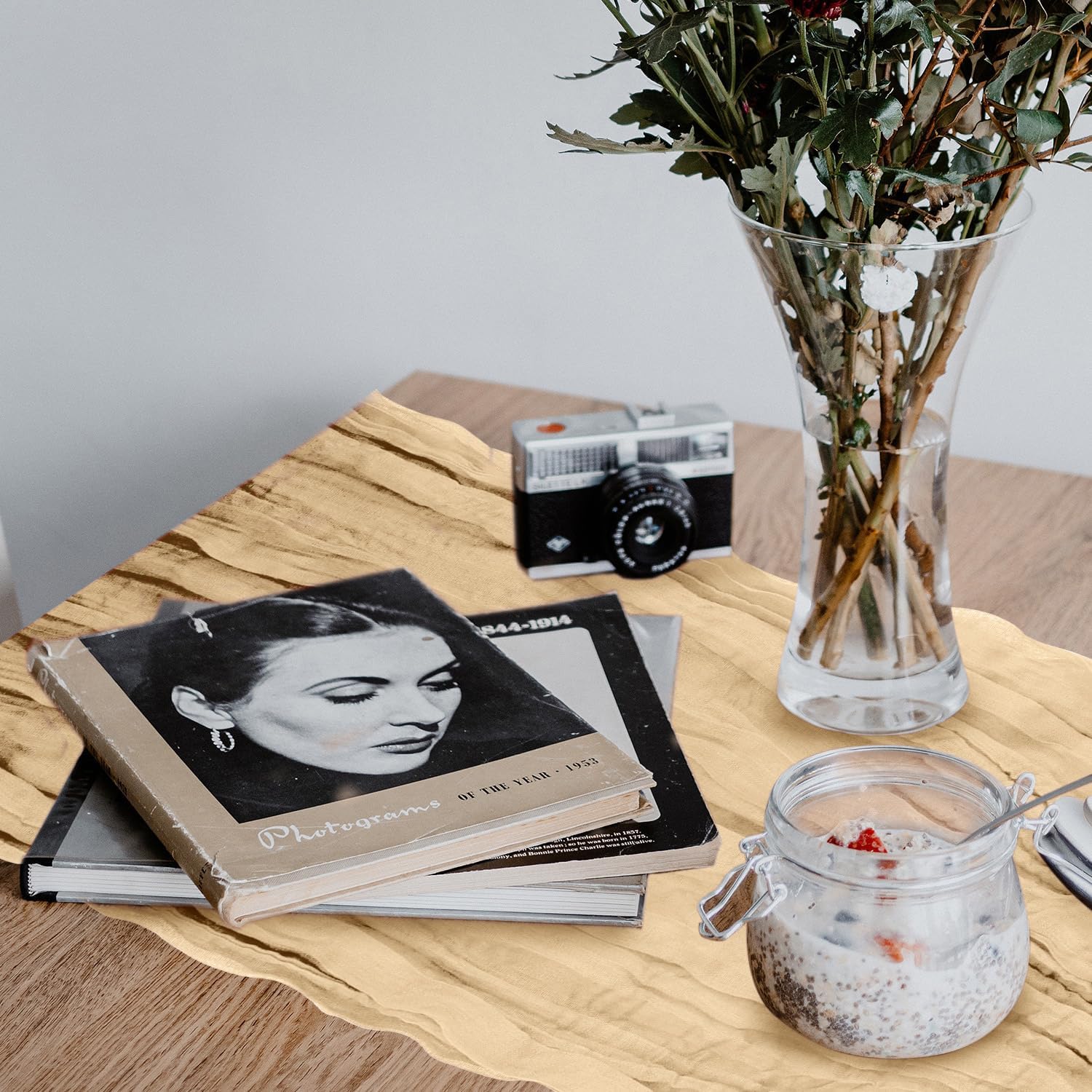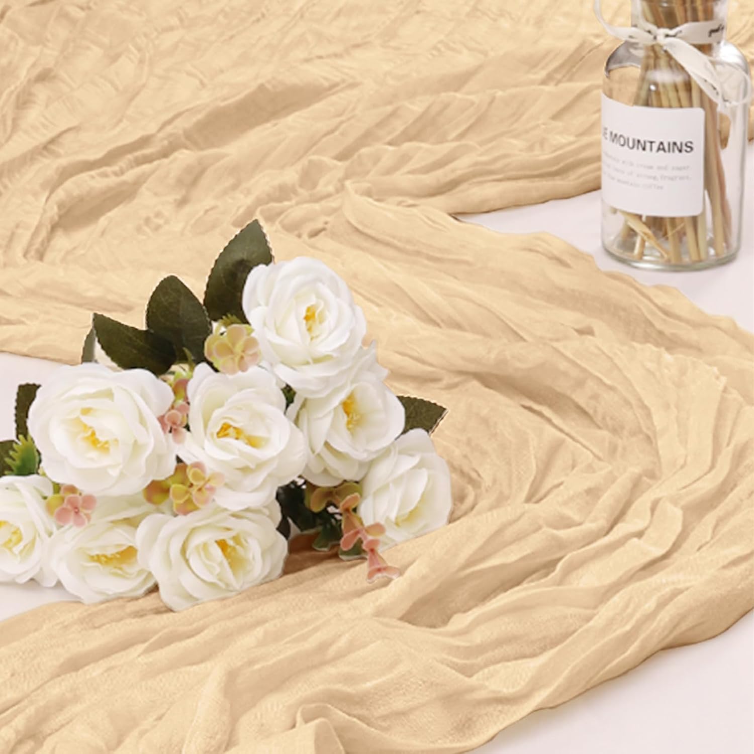 • 【Soft Material】: Made of high quality polyester, soft to touch, comfortable and durable. Wrinkled design cheese cloth farbic, delicate edges and stitches, adopts seamless technique makes this sheer table runner more graceful than traditional fabrics. Our cheesecloth wedding table runners are durable, the colour stays for a long time, does not fade and can be reused.