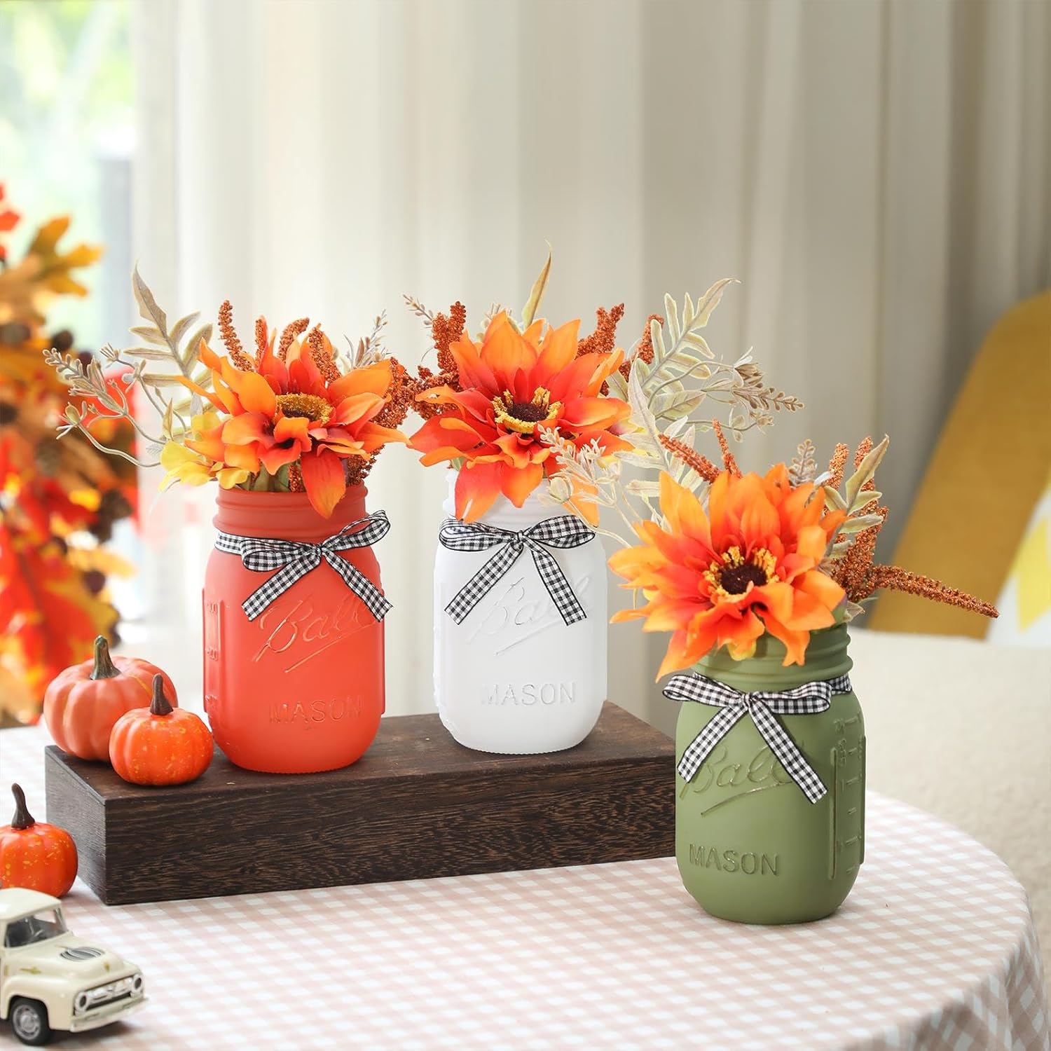 Thanksgiving Fall Mason Jar Centerpiece for Table with Artificial Flowers, Set of 3 Mason Jars Farmhouse Decor Decorative Jars for Thanksgiving Home Decor, Thanksgiving Dinner Table Centerpiece