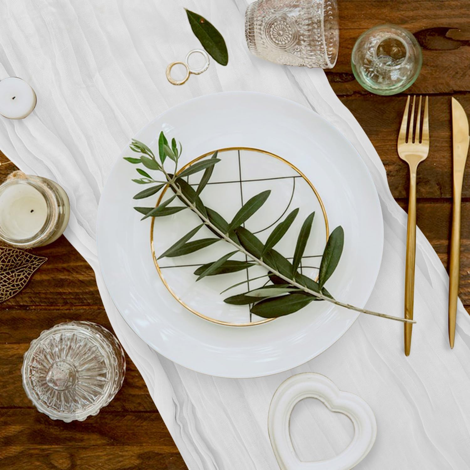 • 【Soft Material】: Made of high quality polyester, soft to touch, comfortable and durable. Wrinkled design cheese cloth farbic, delicate edges and stitches, adopts seamless technique makes this sheer table runner more graceful than traditional fabrics. Our cheesecloth wedding table runners are durable, the colour stays for a long time, does not fade and can be reused.