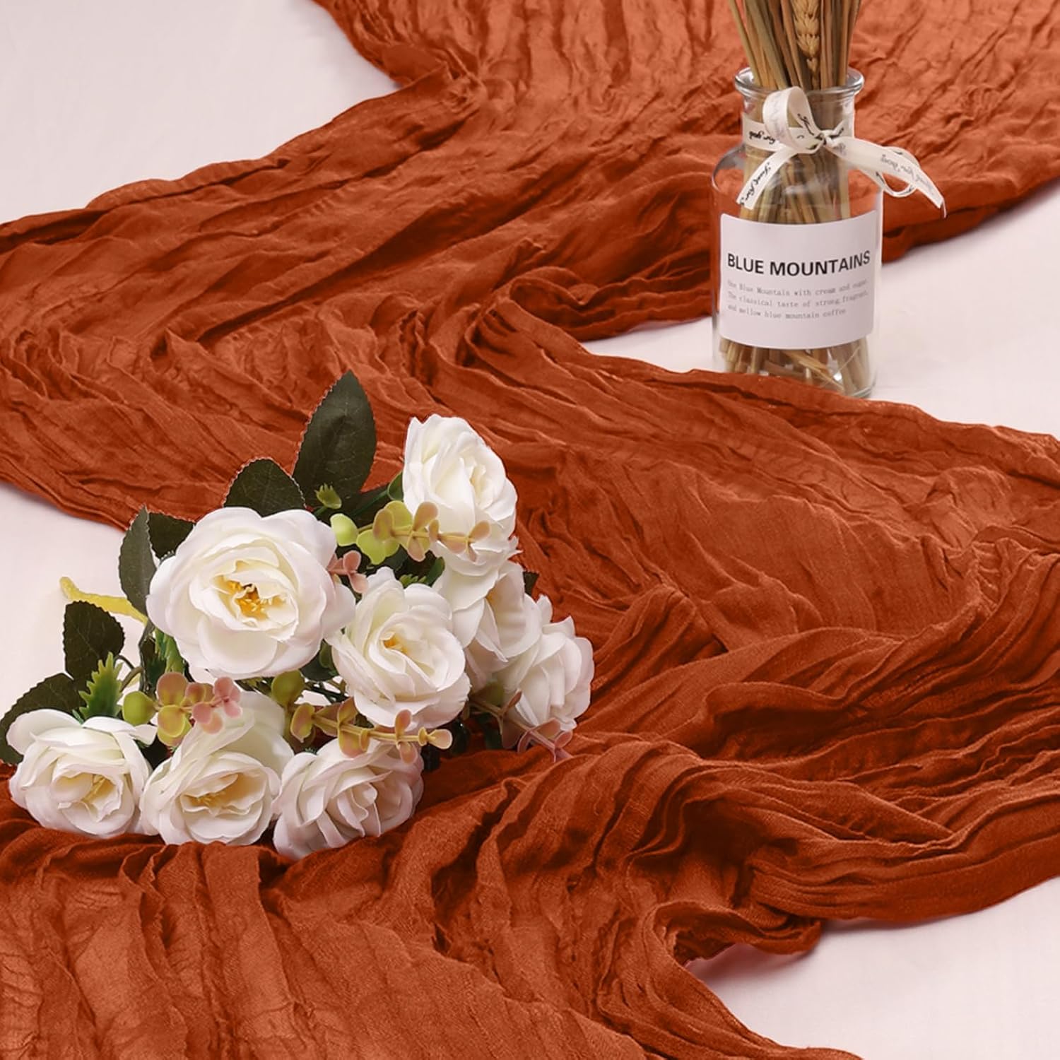 • 【Soft Material】: Made of high quality polyester, soft to touch, comfortable and durable. Wrinkled design cheese cloth farbic, delicate edges and stitches, adopts seamless technique makes this sheer table runner more graceful than traditional fabrics. Our cheesecloth wedding table runners are durable, the colour stays for a long time, does not fade and can be reused.