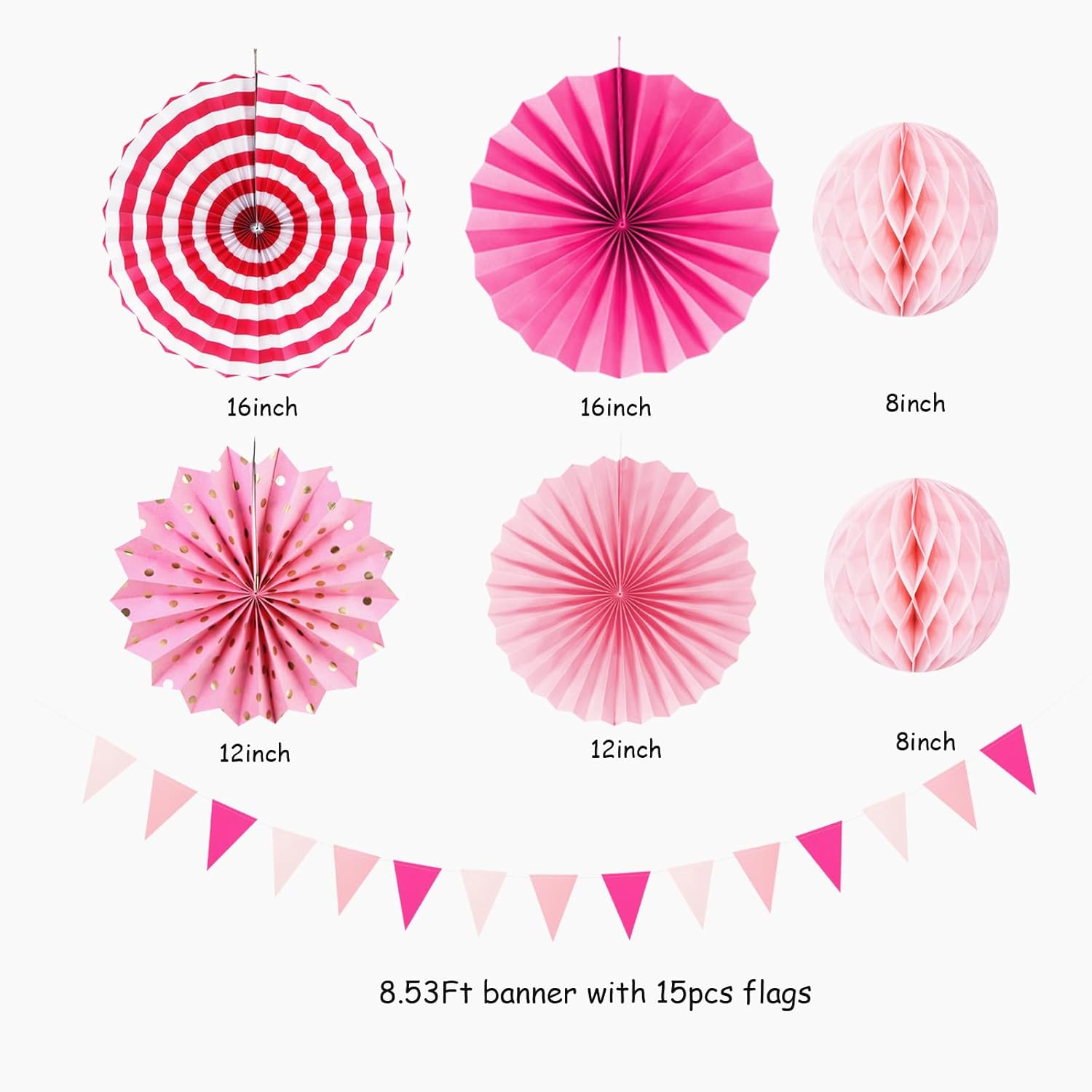 • [Package Includes] Rose hot pink party decorations kit contains: 1 x triangle bunting, 4 x paper fans, 9 x tissue pom poms, 2 x honeycomb balls, 4 x paper lanterns, a total of 20 pieces of various sizes of decorations. Better embellish your party.