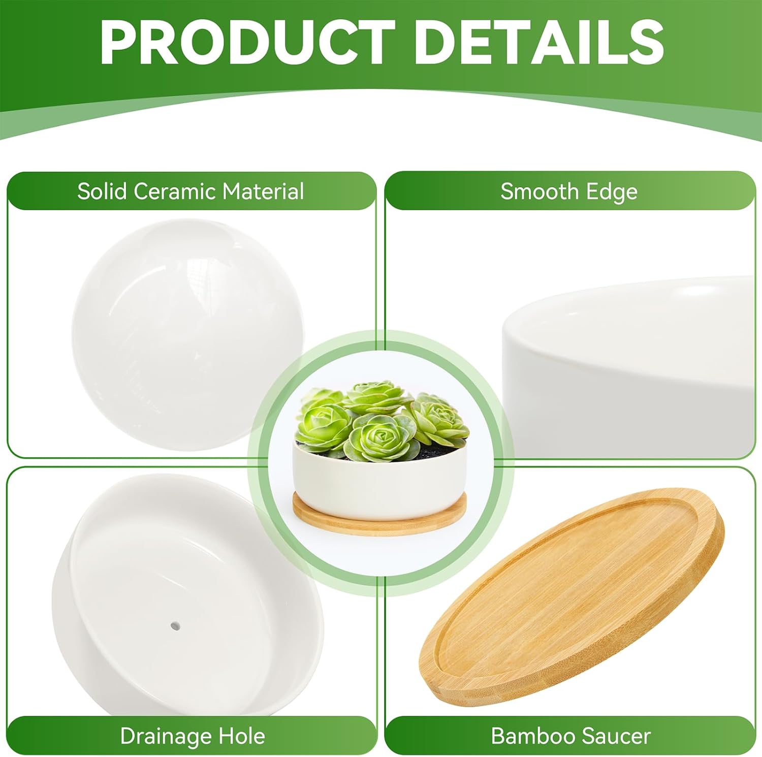 • Succulent Pots Great Value:2-pack round plant pots with drainage and bamboo tray are ideal for small greenery,succulents,cactus,herbs,or flowers.A great way to bring a touch of nature to your indoor spaces.(Plants not included)