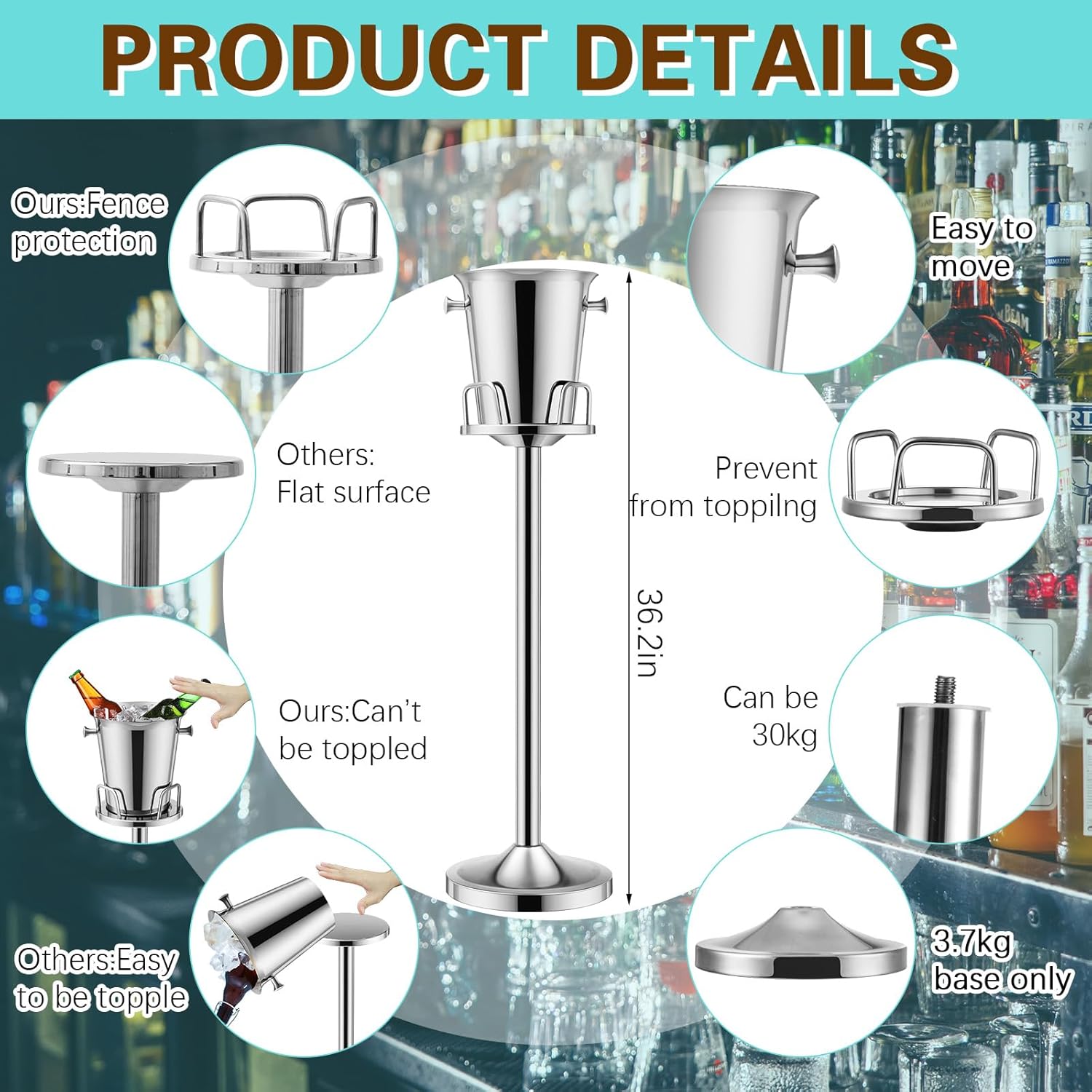 Lallisa 2 Pieces Wine Ice Bucket with Stand Stainless Steel Standing Champagne Ice Bucket Cube Container on Stand for Beer KTV Club Bar BBQ Wedding 35.8in 5L (Silver)