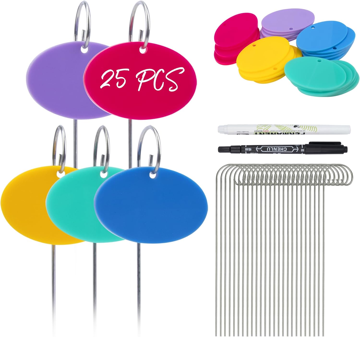 • Package and Size: 25 x acrylic plant label (measuring 1.6 x 2.4 inch/4 x 6 cm), 25 x stainless steel stake (7.9 inch/20 cm), 2 x markers (black & white). Labels come in 5 colors: red, purple, yellow, light green and blue.