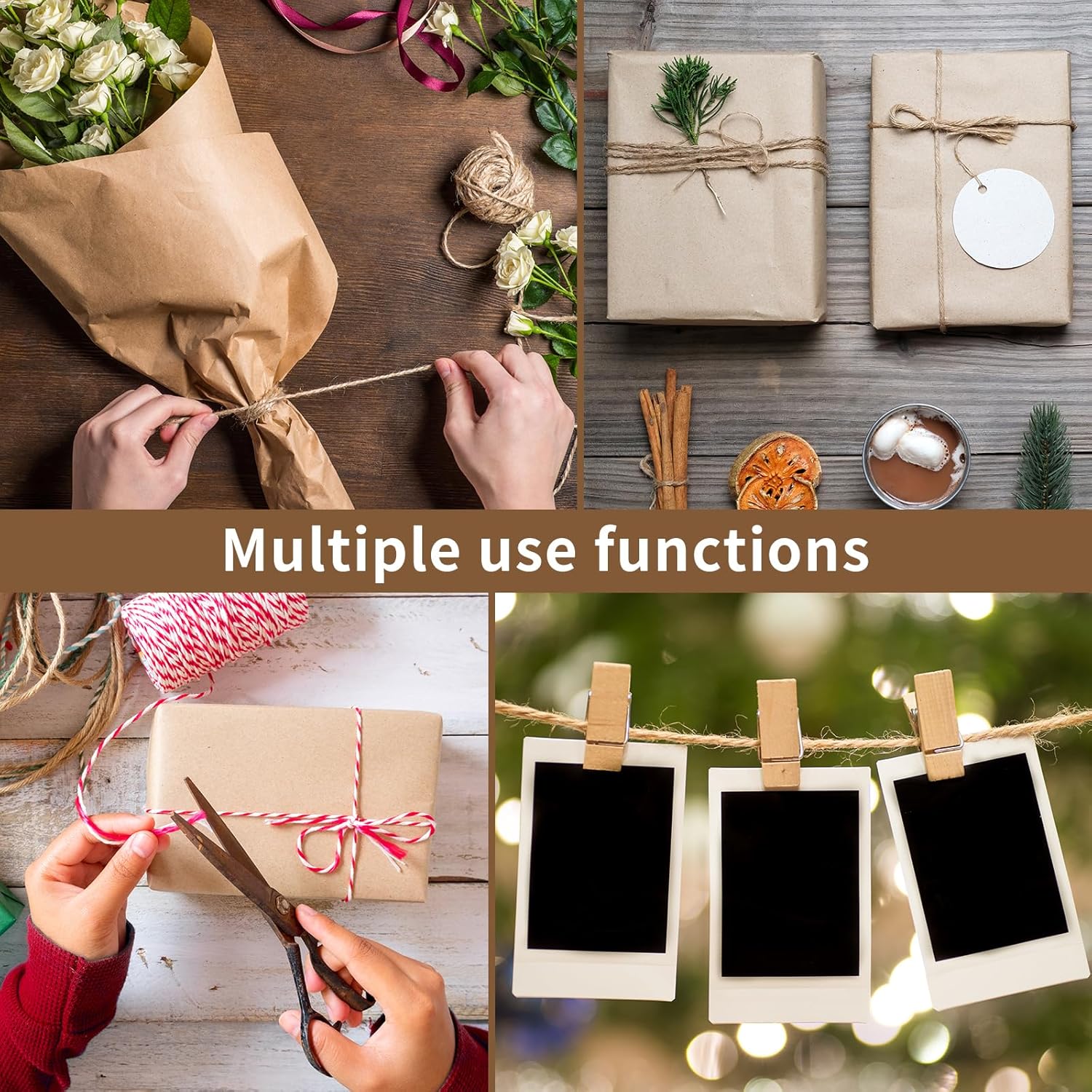 • ♥ Various applications: 3mm jute rope that contains four strands is known for its high tensile strength and durability, making it ideal for heavy-duty applications like shipping, packaging, construction, and landscaping. Jute twine is indeed very versatile and can be used for a variety of indoor and outdoor applications. It is commonly used for gift wrapping, plant support, weaving baskets, creating burlap wreaths, as well as in crafting, household organization, and gardening.