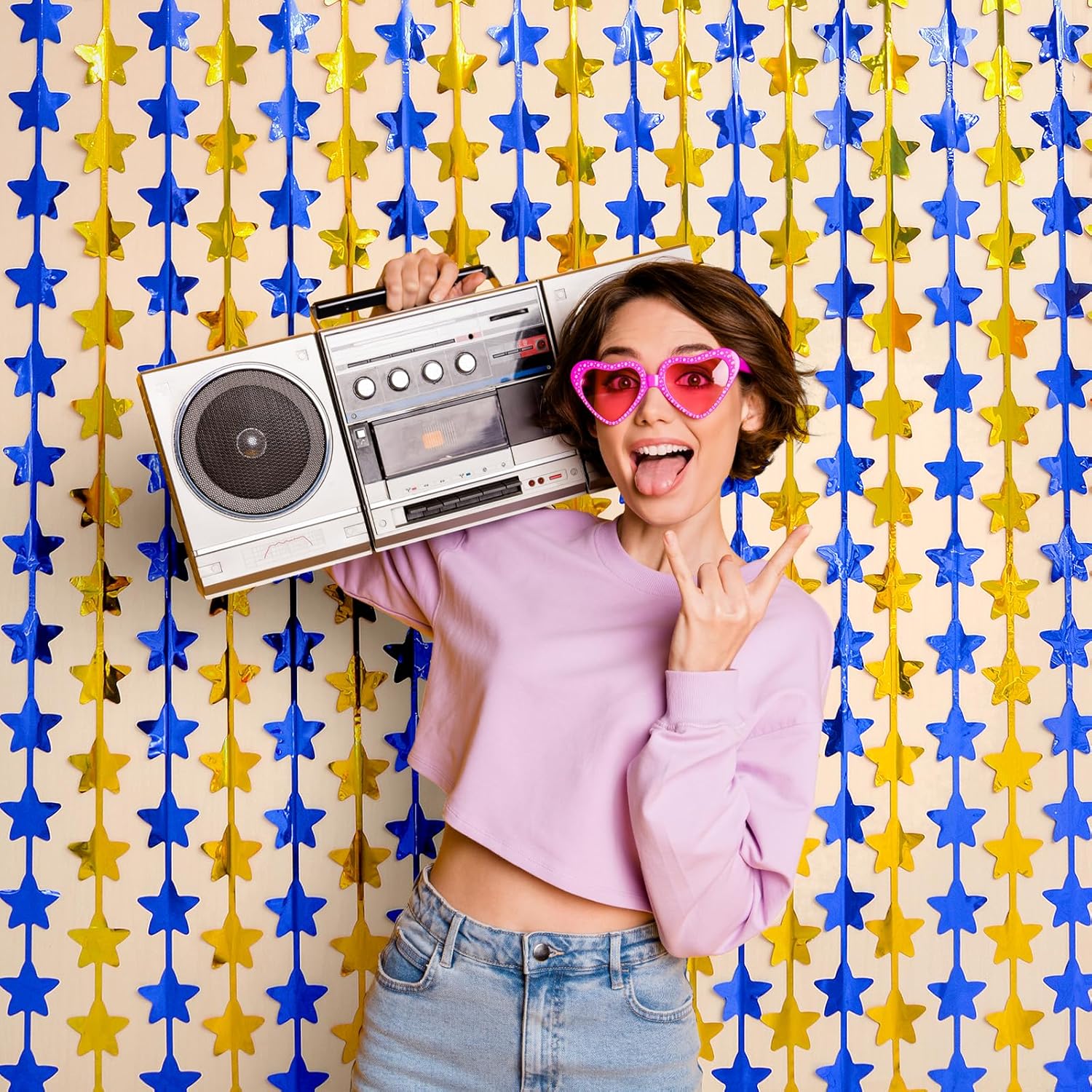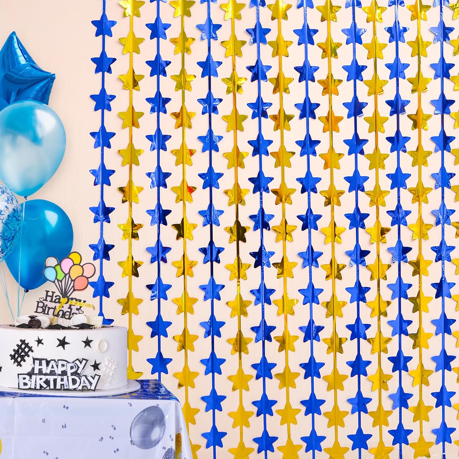 • πŸ’›γ€ TINSEL MATERIAL 】: These blue and gold star metallic foil fringe curtains are made of tinsel. They are lightweight and durable fringe curtains. These high-quality fringe curtains are tough, unbreakable, and can be used for a long time.