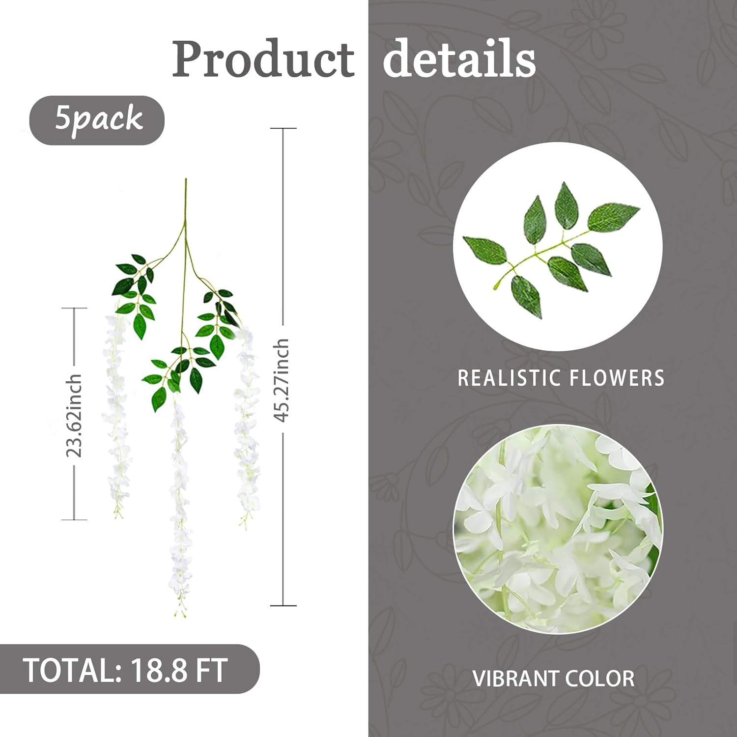 • 【Package Included】5 pieces of silk white wisteria hanging flowers, each length 45.27 inches. Every artificial wisteria garland has 3 branches and 6 leaves, the wisteria flower petal length is 23.62 inches. (Note: There may be some color differences in different lights)