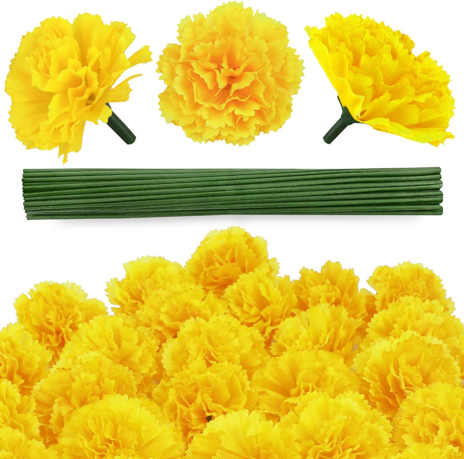 30 Pcs Artificial Marigold Flowers,3.54" Silk Marigold Flower Heads with Stems,Yellow Flowers Artificial for Diwali Decor,Indian Wedding,Home,DIY Wreath Garland,Day of The Dead Decorations