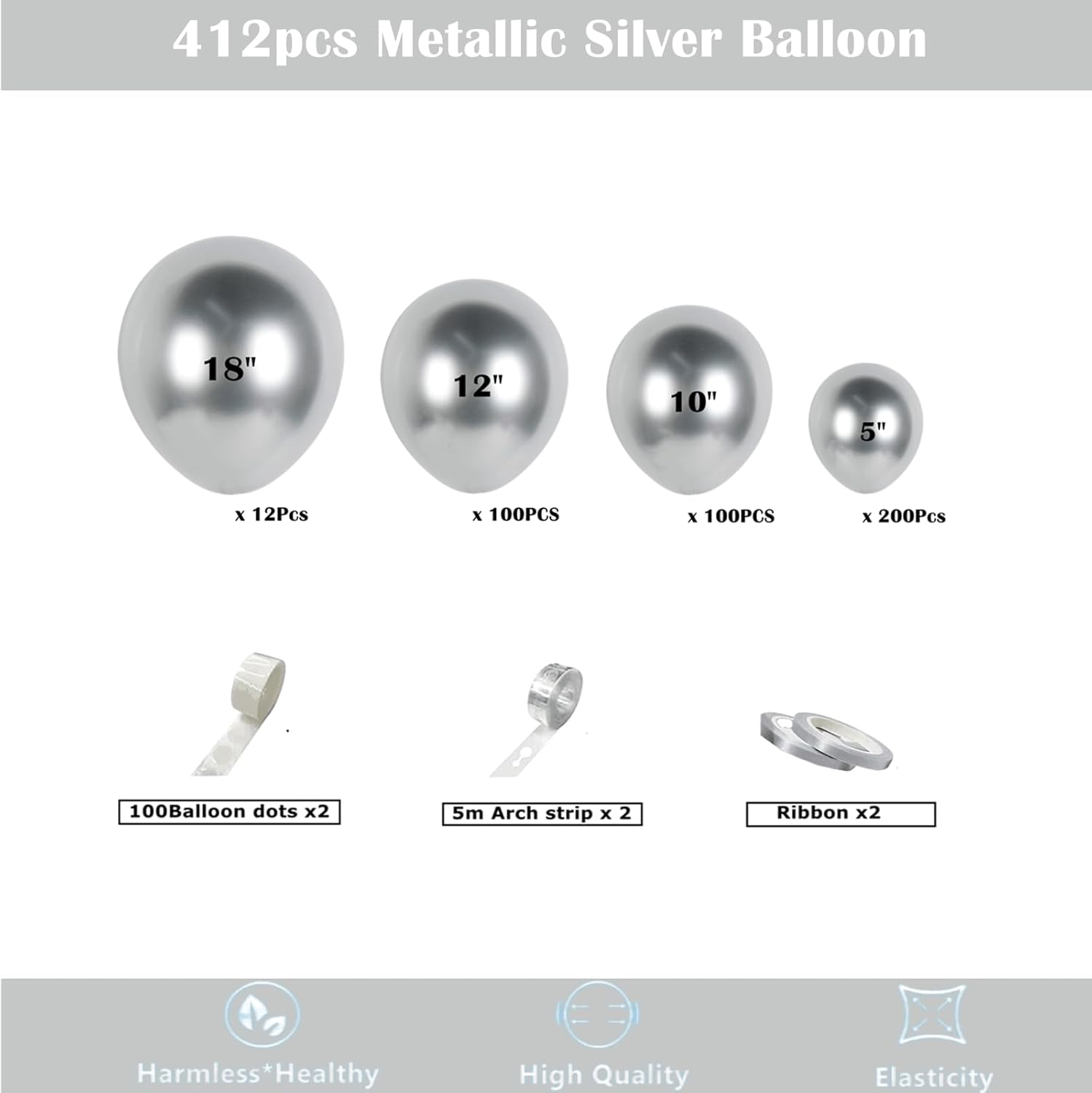 • METALLIC SILVER BALLOON ARCH GARLAND KIT: Includes 412 Metallic silver Balloons, 18inch 12pcs, 12inch 100pcs, 10inch 100pcs, 5inch 200pcs , 2 rolls of Balloon glue point(200pcs), 2 rolls of balloon decoration strip(32.8 feet / 5m*2 with 220 holes), 2 roll of ribbon. plenty in quantity, perfect for making indoor or outdoor them decoration.