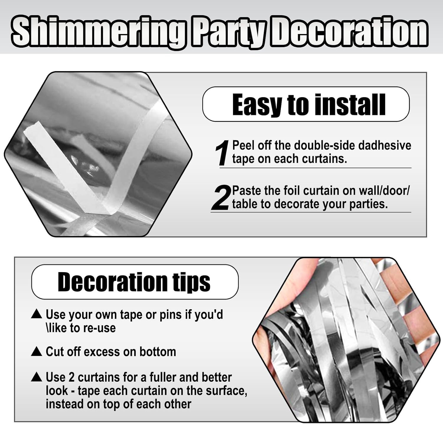 • Easy To Assemble | Strong Adhesive | Not Easy Fade : The foil fringe curtain backdrop party decorations come with double-sided adhesive tape, easy to use, just tear off the back of adhesive tape, then paste this streamers backdrop curtains on the top of wall, window, table, or as door fringe decoration.