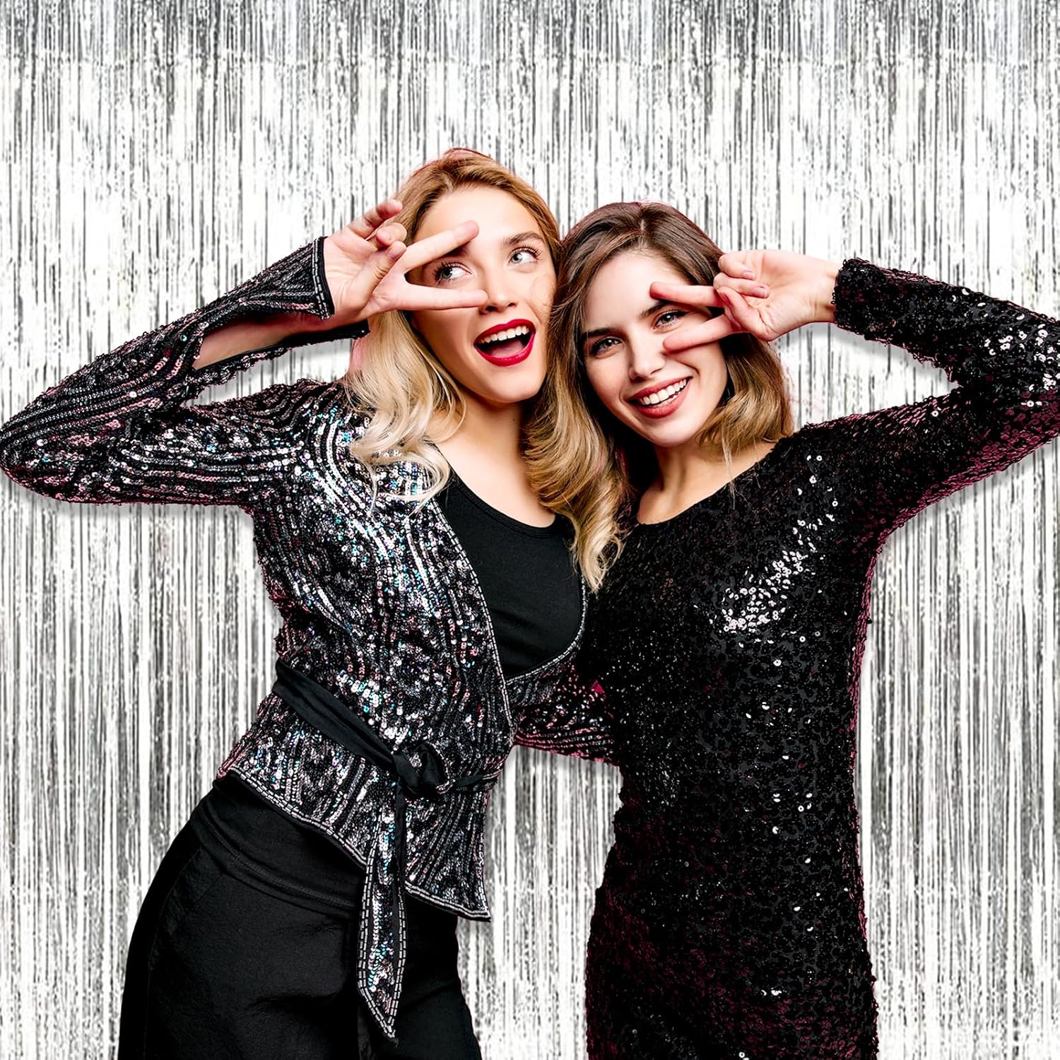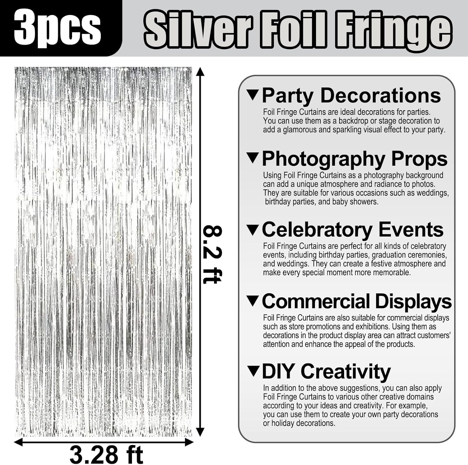3 Pack Silver Foil Fringe Curtain Backdrop, 3.28Ft x 8.2Ft Metallic Tinsel Foil Fringe Streamer Curtains for Photo Booth, Christmas Day, Thanksgiving, Wedding, New Year Party Decorations
