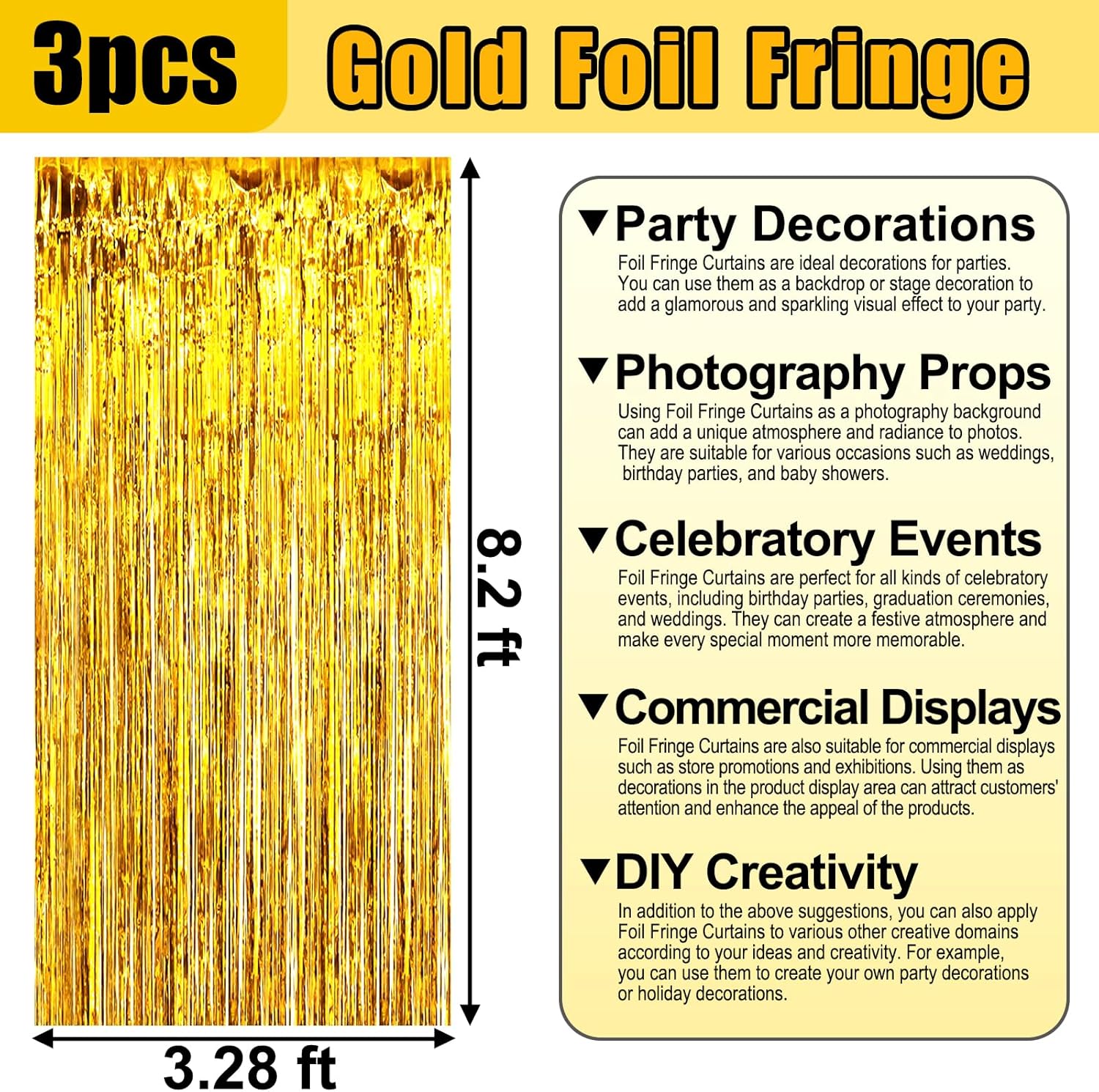 • Widely Applications:The foil fringe backdrop are wonderful finishing touch for any theme party such as birthday party, theme party, Halloween, Christmas, New Year Eve, bachelorette party, wedding, bridal shower, baby showers, graduations Etc.