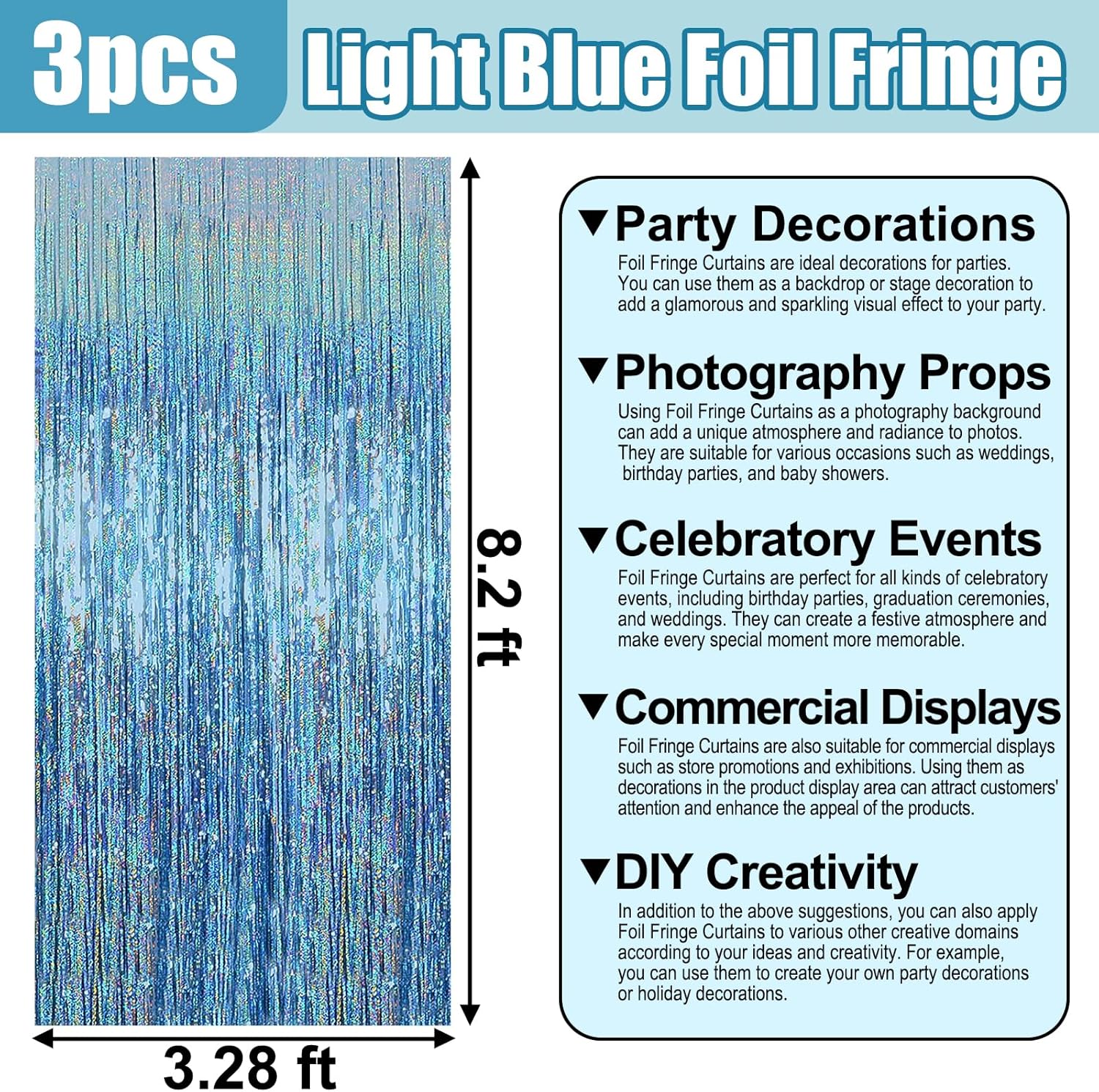 3 Pack Light Blue Foil Fringe Curtain Backdrop, 3.28Ft x 8.2Ft Metallic Tinsel Foil Fringe Streamer Curtains for Photo Booth, Mother's Day, Easter, Birthday, Wedding Party Decorations