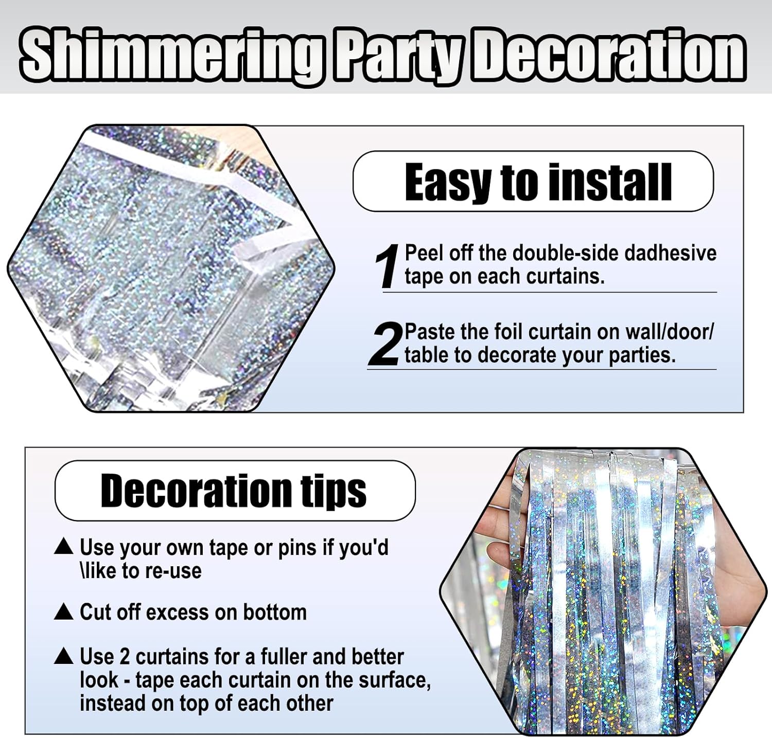 • Easy To Assemble | Strong Adhesive | Not Easy Fade : The foil fringe curtain backdrop party decorations come with double-sided adhesive tape, easy to use, just tear off the back of adhesive tape, then paste this streamers backdrop curtains on the top of wall, window, table, or as door fringe decoration.