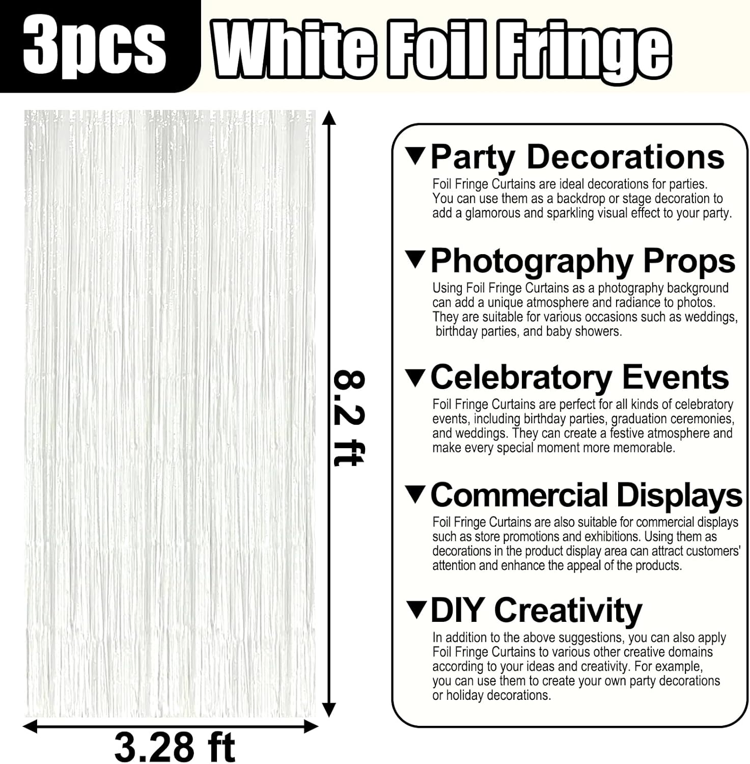 • Widely Applications:The foil fringe backdrop are wonderful finishing touch for any theme party such as birthday party, theme party, Halloween, Christmas, New Year Eve, bachelorette party, wedding, bridal shower, baby showers, graduations Etc.