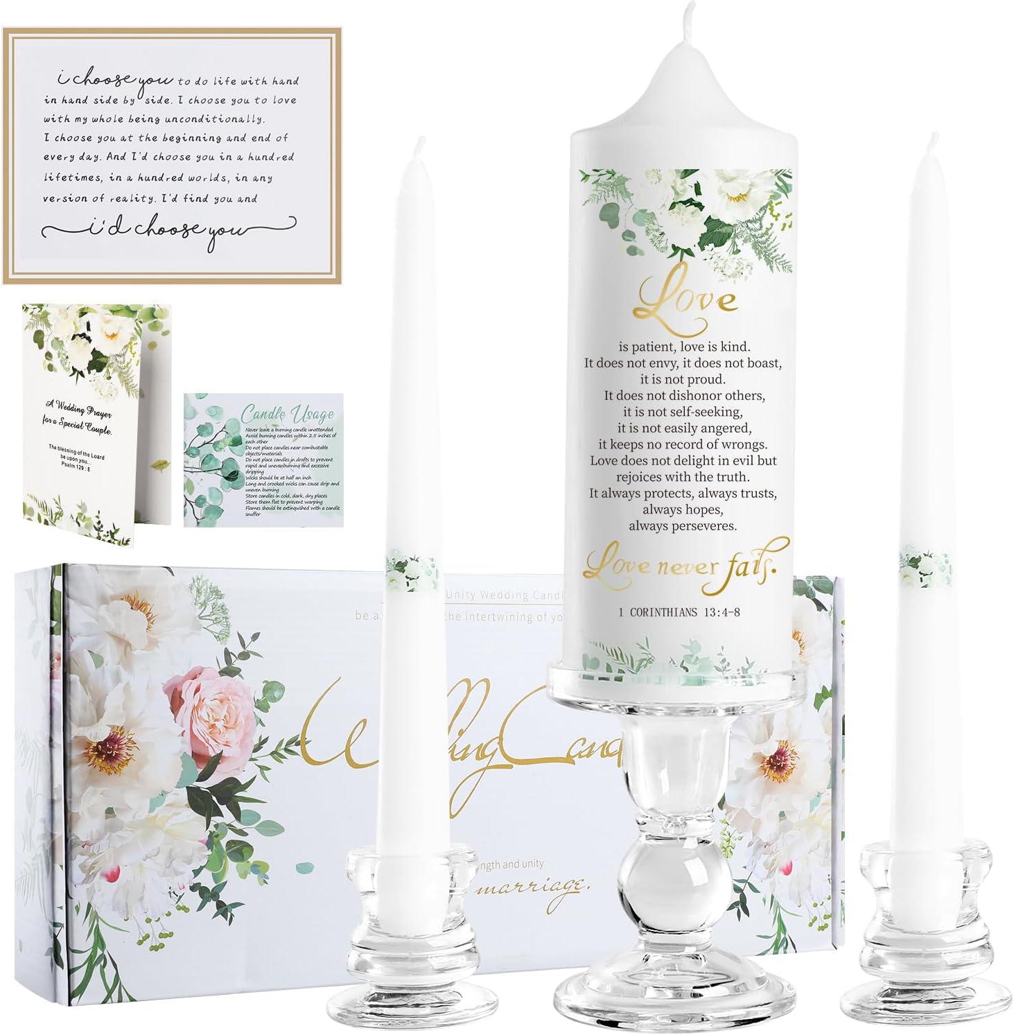 • 💕Meaningful Wedding Cards: Enhance the emotional depth of your wedding with the two wedding gift cards included in this candle set. The "I CHOOSE YOU" wedding cards for bride and groom have deep sentimental value and can be cherished as wall decor, a constant reminder of the vows you exchanged on your special day. In addition, the religious wedding shower card beautifully captures the essence of love in words derived from Psalm 129:8 of the Bible, reflecting the blessing of the couple's union.