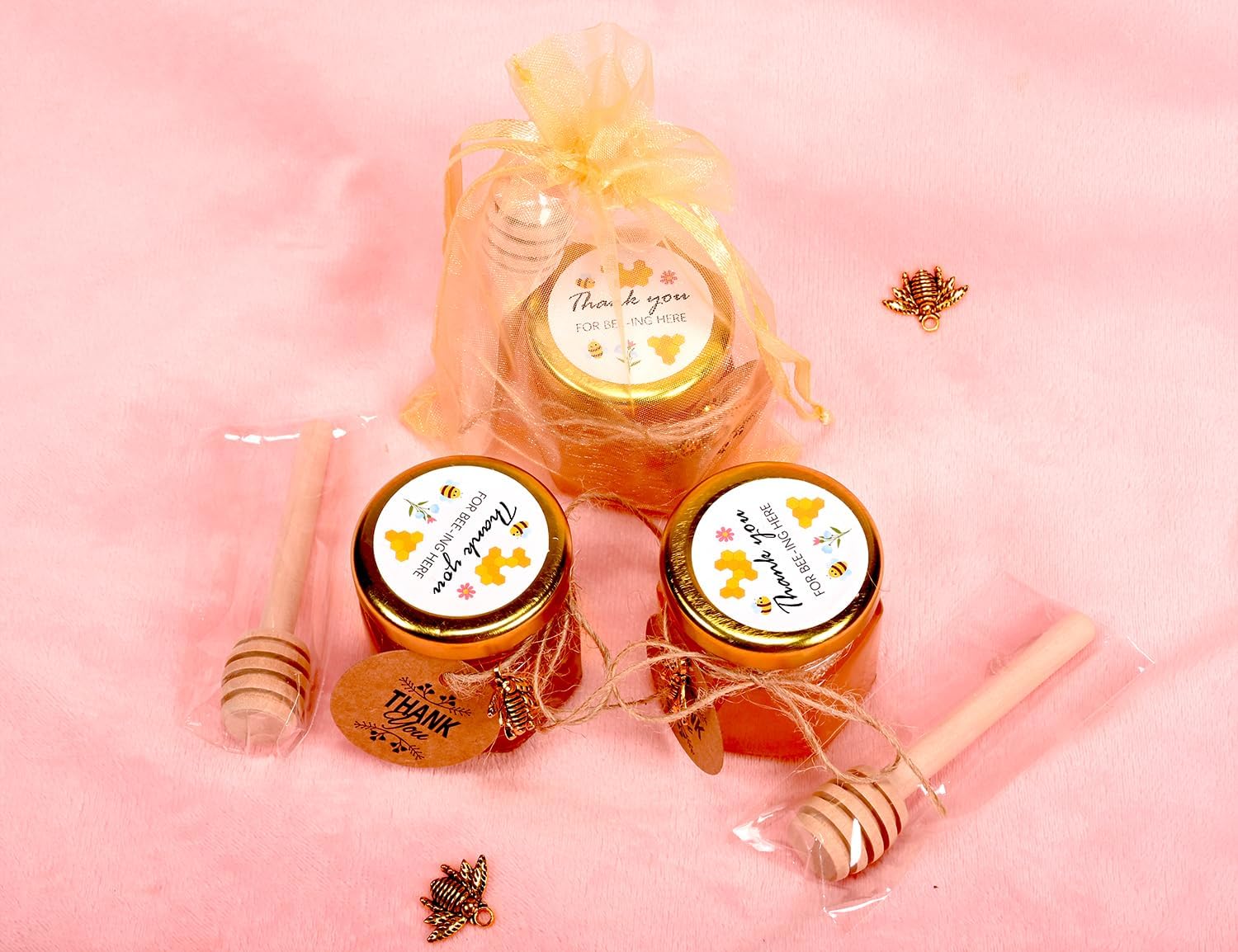 • Adorable Design: Each jar comes with a cute bee pendant and a honey dipper, adding a touch of charm to your baby shower or wedding favors. The included stickers can be used to personalize the lids, making them extra special