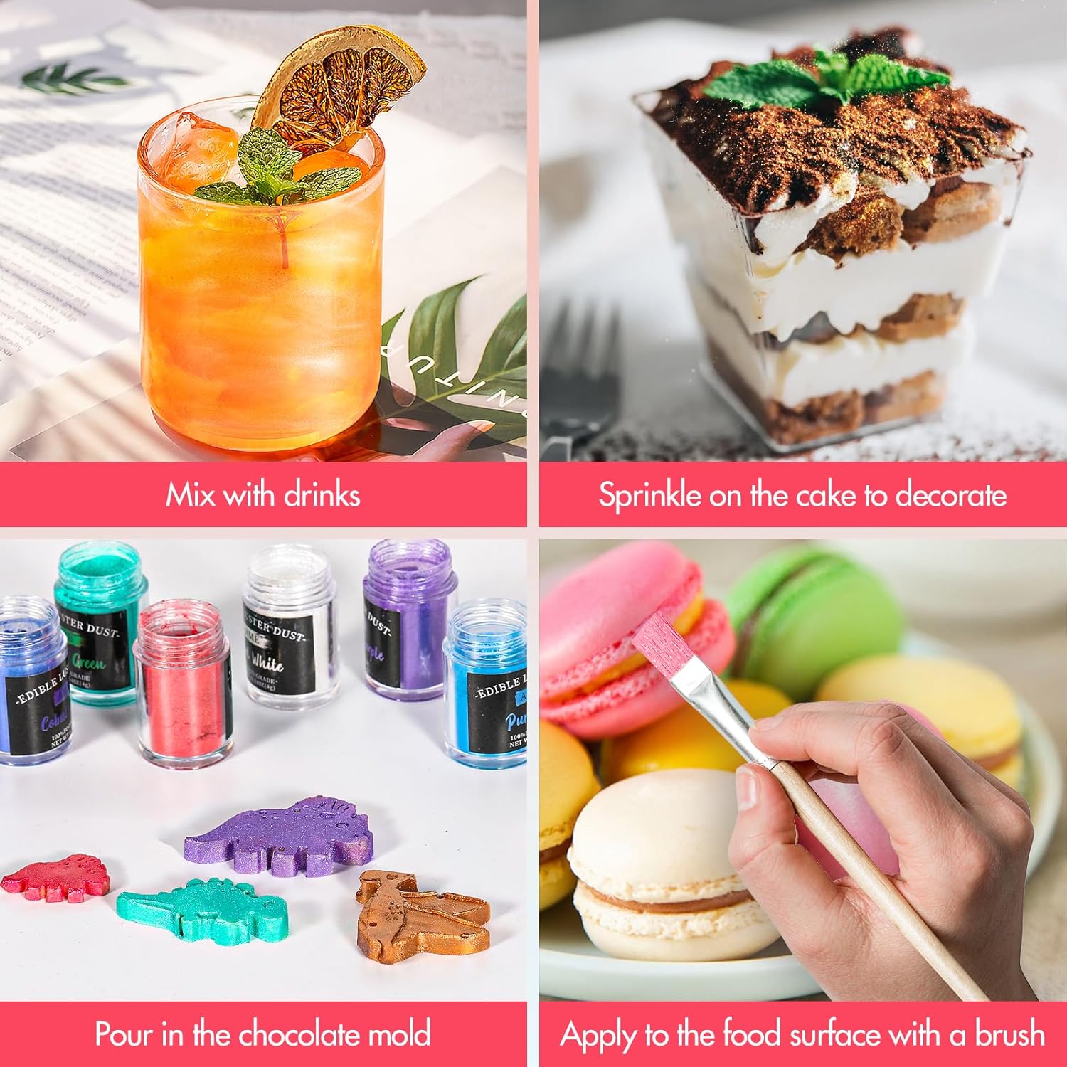 • 🍪【SAFE&VEGAN】The edible glitter is made of 100% food-grade luster dust, mica is edible, ferric oxide and titanium dioxide are all professionally approved and certified edible food grade colorants. Our luster dust sprinkles are fat free, dairy free, gluten free, nut free, non genetically modified and non-toxic. It also has kosher certification. So whether you are a vegetarian or allergy-prone, you can use this pigment without worry. Glitter sprinkles have no taste.