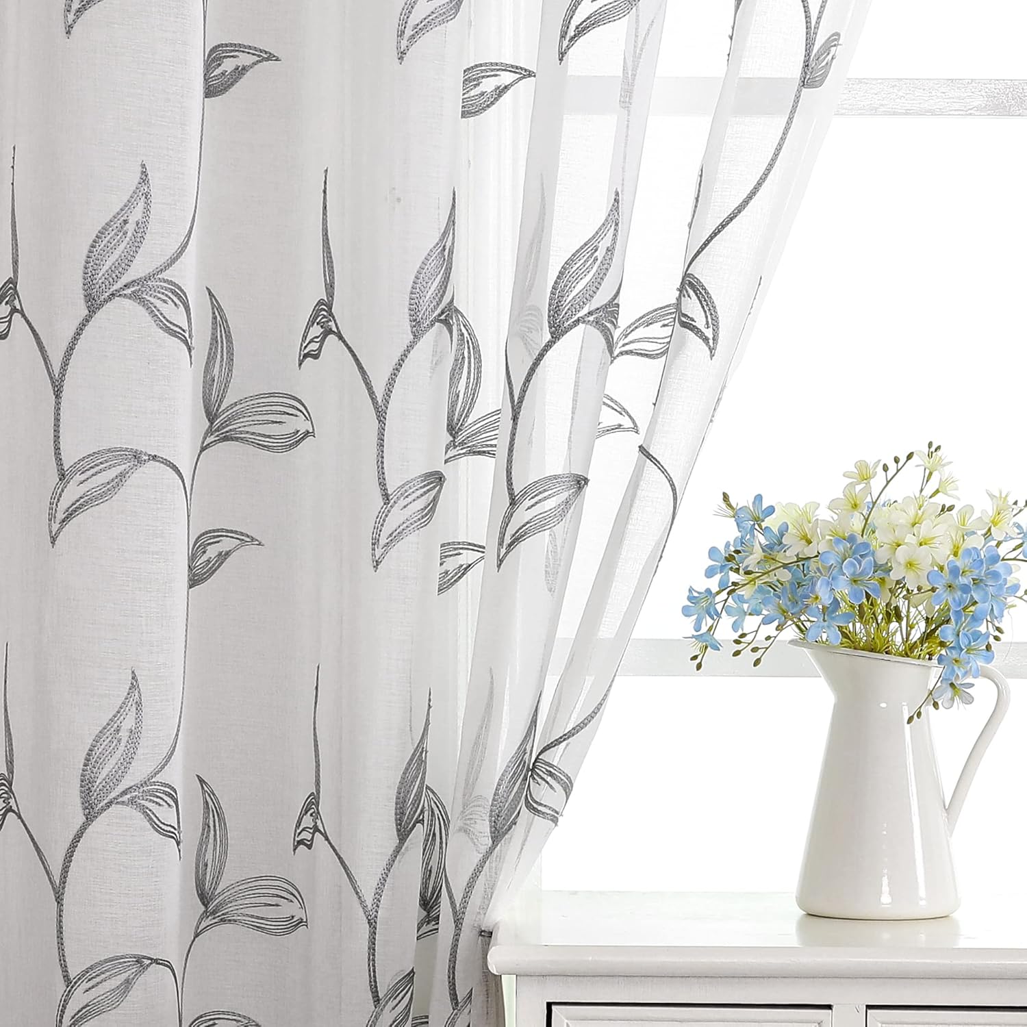 VISIONTEX Sheer Curtains 108 Inch Length 2 Panels, Decor Iron Grey Vine Leaves Embroidery on White Voile Pair, Accent Semi Window Drapes for Kitchen, Living Room and Bedroom, 54" W x 108" L
