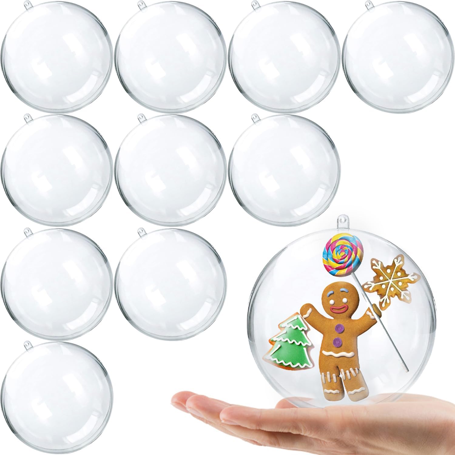 • PACK OF 10: Super value bulk of 10 sets clear plastic ornaments balls, come with total of 20 hemispheres, 10 female and 10 male, simple assembly to get 10 complete spheres balls. Our clear plastic ornaments is round ball globe shape, 100mm in outer diameter. Perfect size, not too big, and not too small.
