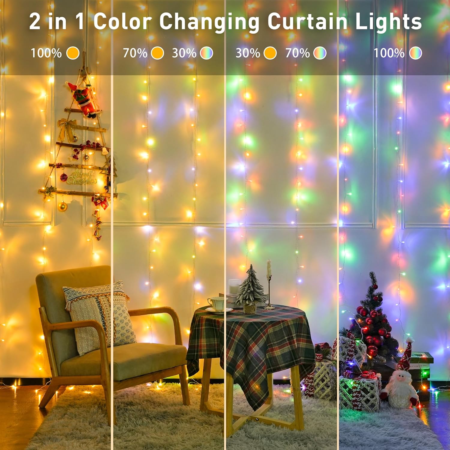 JMEXSUSS 300LED Dual Color Changing Curtain Lights with Remote, 9.8 x 9.8ft Connectable Plug in Christmas String Lights for Bedroom Backdrop Outdoor Decor, Warm White to Multicolor