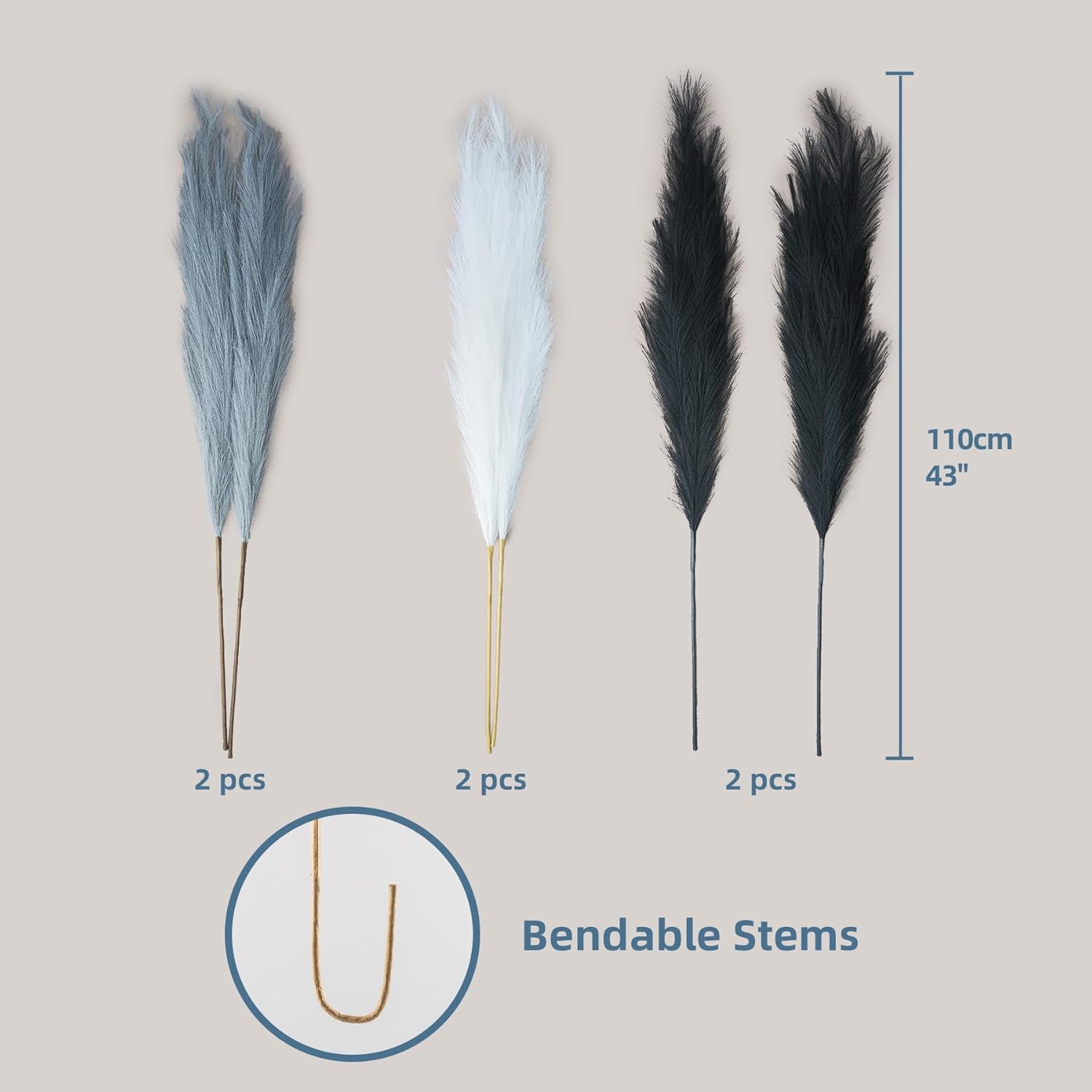 • High End Looking Faux Pampas Grass: It's actually made of a metal wire in the stem and silk feather, it holds shape very well. The pompass grass branches tall bulk is really soft and feather-like, with 18 branches on each stem, and the heads of each stem are designed so you can fluff them up for a fuller look