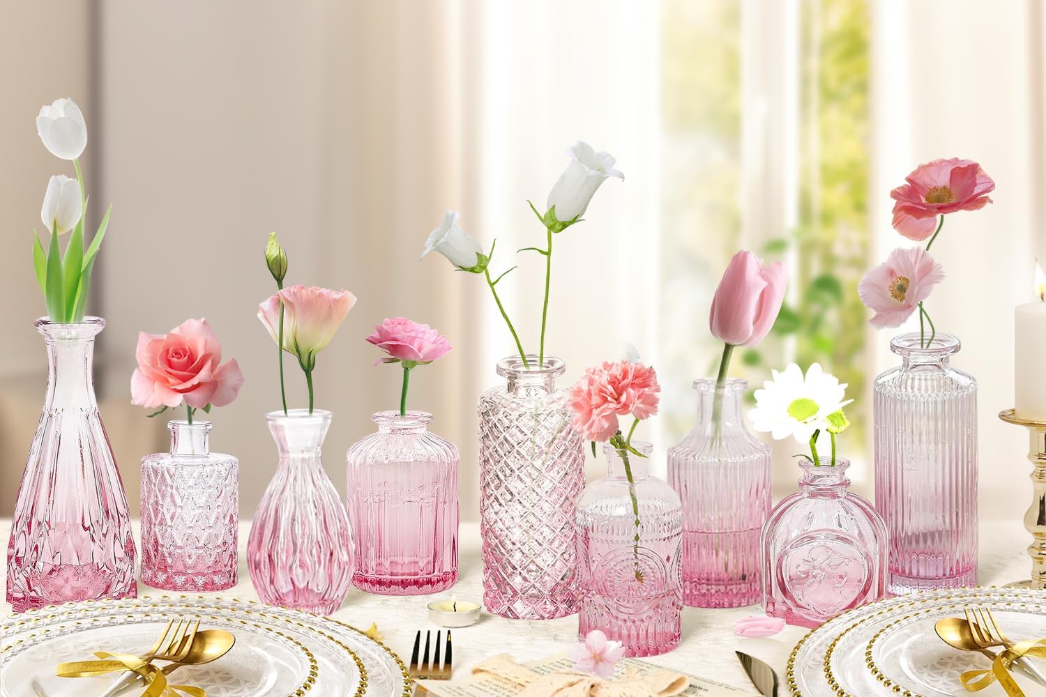 Pink Glass Bud Vases Set of 20 - Mini Vintage Vases for Wedding Decorations Home Table Flower Decor, Small Carved Design Glass for Centerpieces