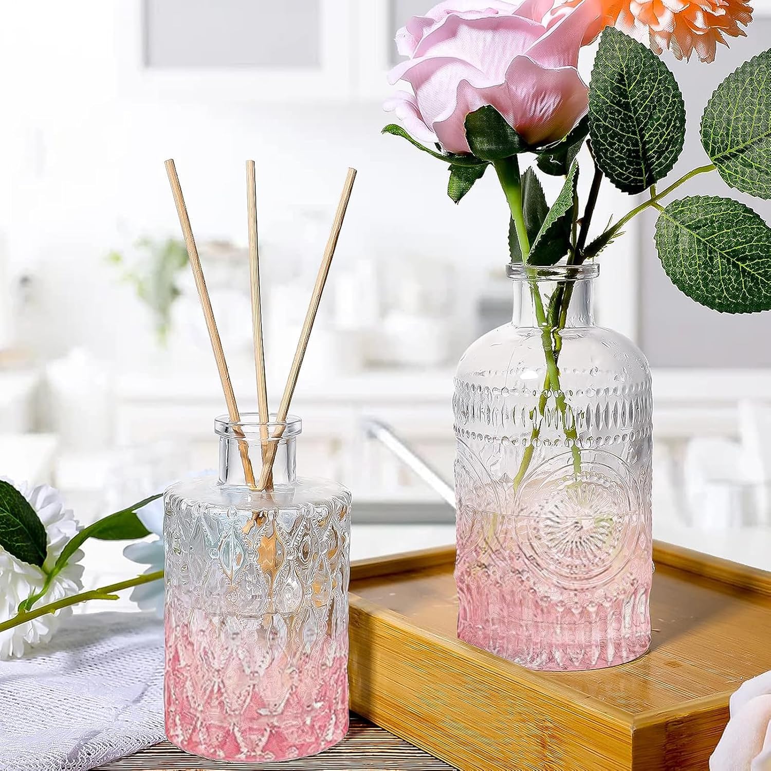 • π•π„π‘π’π€π“πˆπ‹π„: Sized for small flower buds, dried flowers, and reed diffusers, budvases with patterned surface makes it shine under the light. The small neck of vase creates a perfect sense of line. You can see the beauty of flowers from clear glass sets.