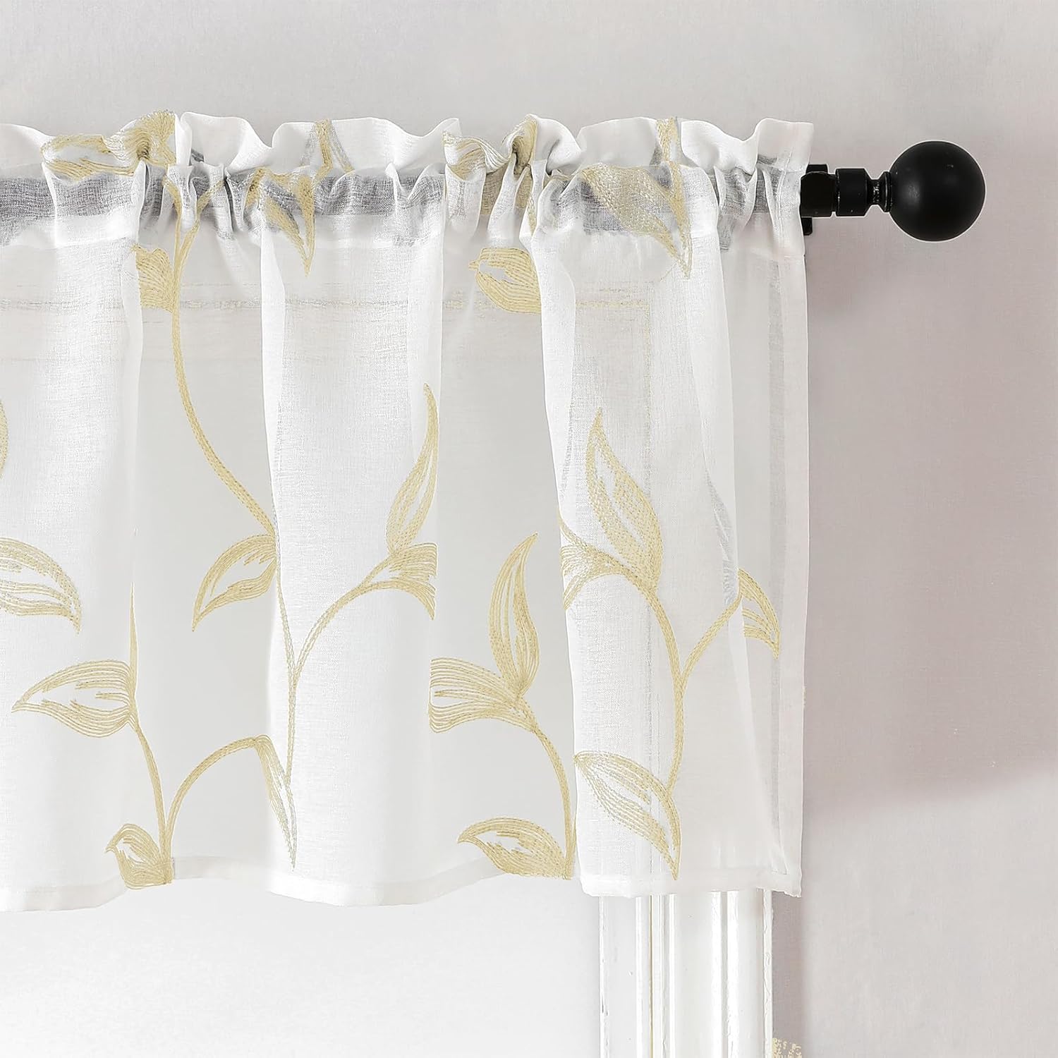 VISIONTEX Sheer Voile Curtain Valances, Decorative Leaves Embroidered, Rod Pocket Window Treatment for Kitchen/Rustic Bedroom/Living Room (54 x 16 Inch,1 Panel)