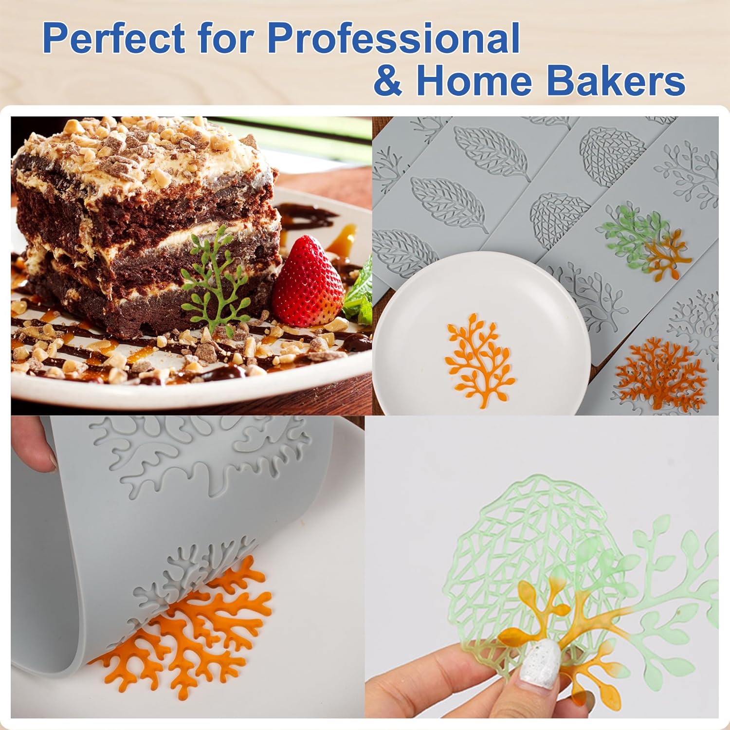 • Silicone Leaf Molds: 5 different pattern quilted leaf chocolate molds coral branch leaves fondant lace pad, 1 dough scraper and 1 silicone spatula; This silicone baking mold set is well made and detailed