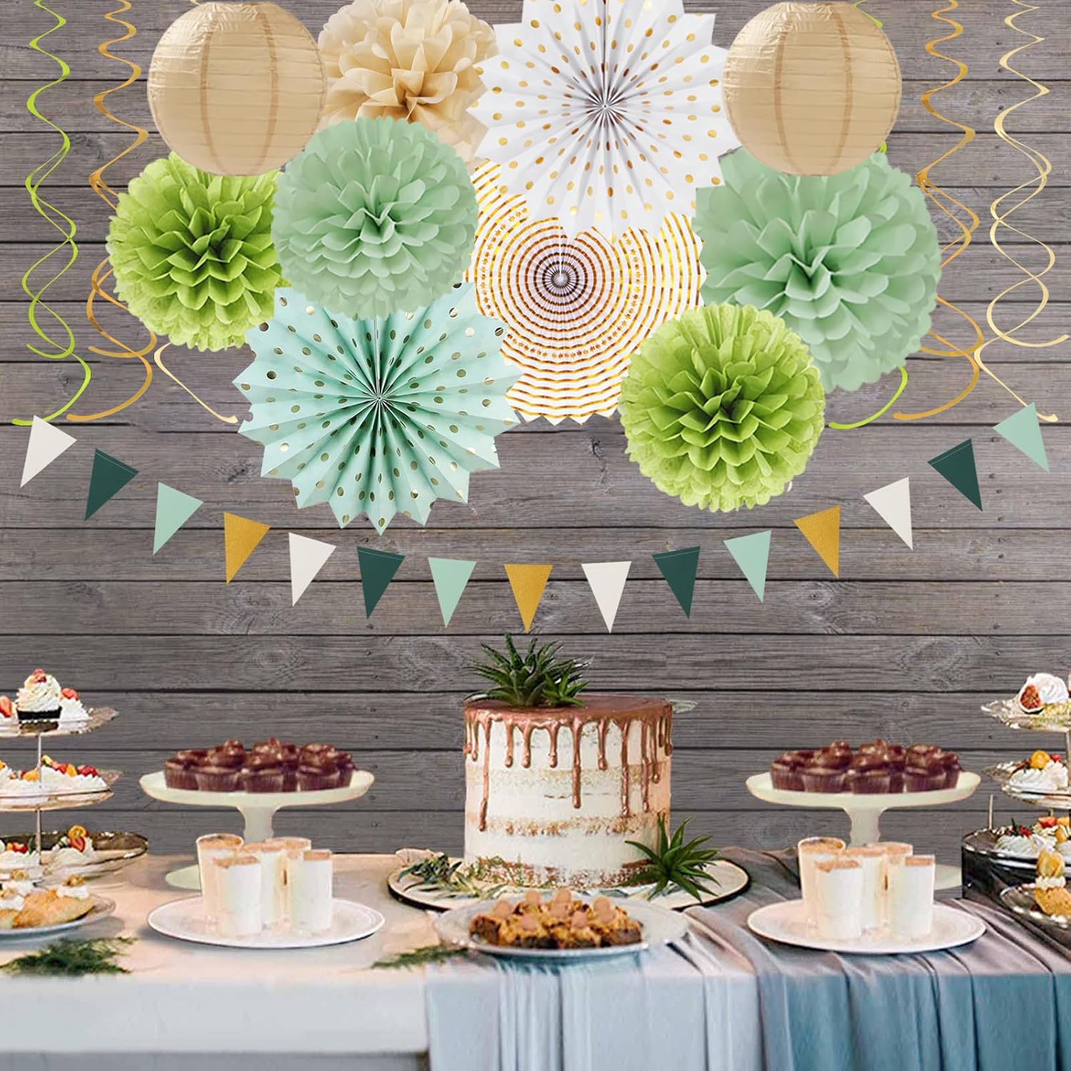 Sage-Olive Green Gold Brown Boho Party-Decorations - 33pcs Paper Lanterns Fan, Banner,Streamers Tassel Garland,Tissue Pom Poms,Baby Bridal Shower Birthday Wedding Bachelorette Engagement Decor Hugtmr