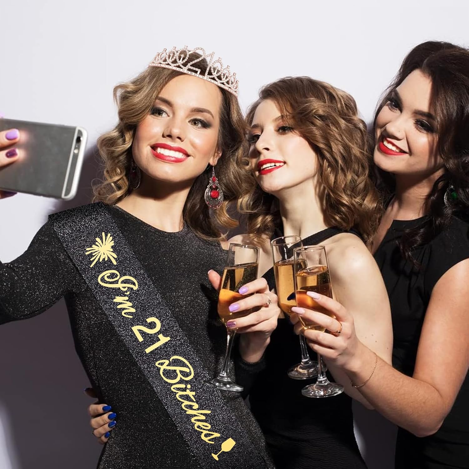 • 21st Birthday Decorations Set: Coming with Black Glitter “I am 21 Bitches” Sash, Rhinestone 21st Birthday Crown Rose Gold, Happy 21 Birthday Cake Topper and Rose Gold 21 Birthday Candles for 21st Birthday, and a classical birthday card, all has been packed in a cute gift box for ready to impress the 21 birthday girl.