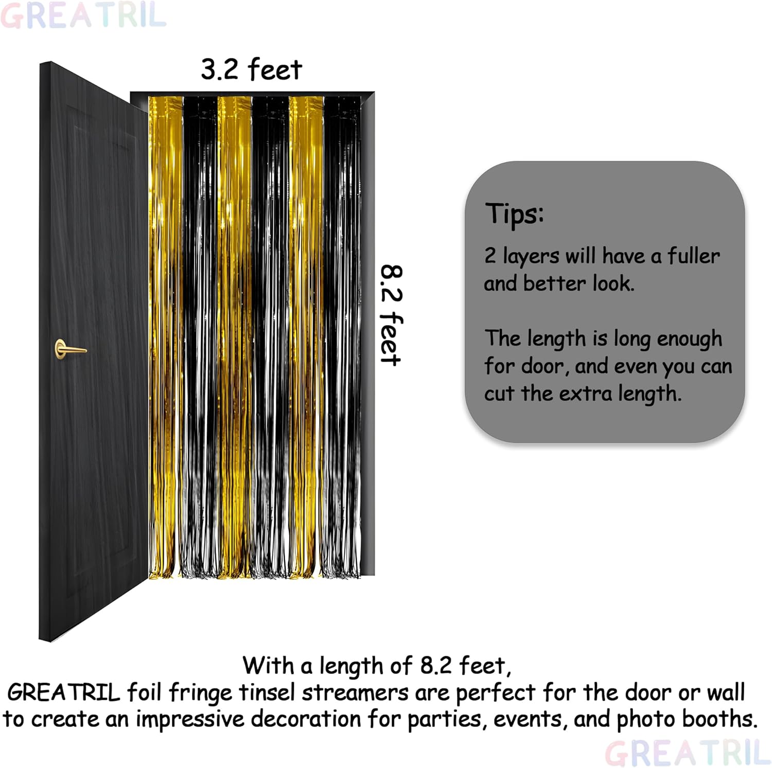 Black and Gold Party Streamers Decoration - GREATRIL Foil Fringe Backdrop for 2026 NYE/Anniversary/Farewell/Cocktail/Prom/EID/Birthdays - 3.2ft X 8.2ft - 2 Packs
