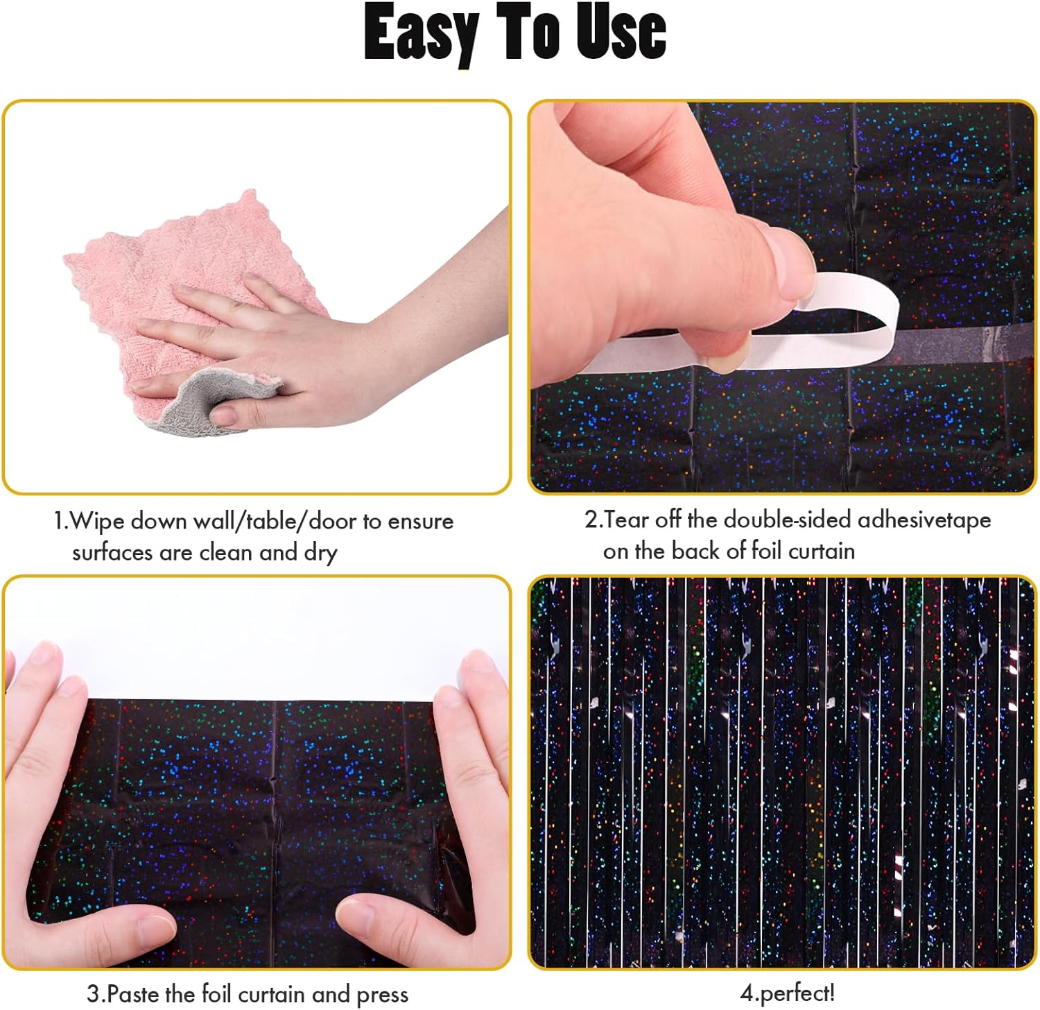 • 🎉NO HASSLE INSTALLATION - The foil curtain backdrop comes with double sided tape on the top, peel plastic strip off and it would be very easy to paste on smooth surfaces such as wall, window, table, door or anywhere you like. You can cut the foil curtain with scissors into the suitable Length, assemble the party streamers side by side to make the backdrop larger, or layer the backdrop curtains to get a thicker effect.