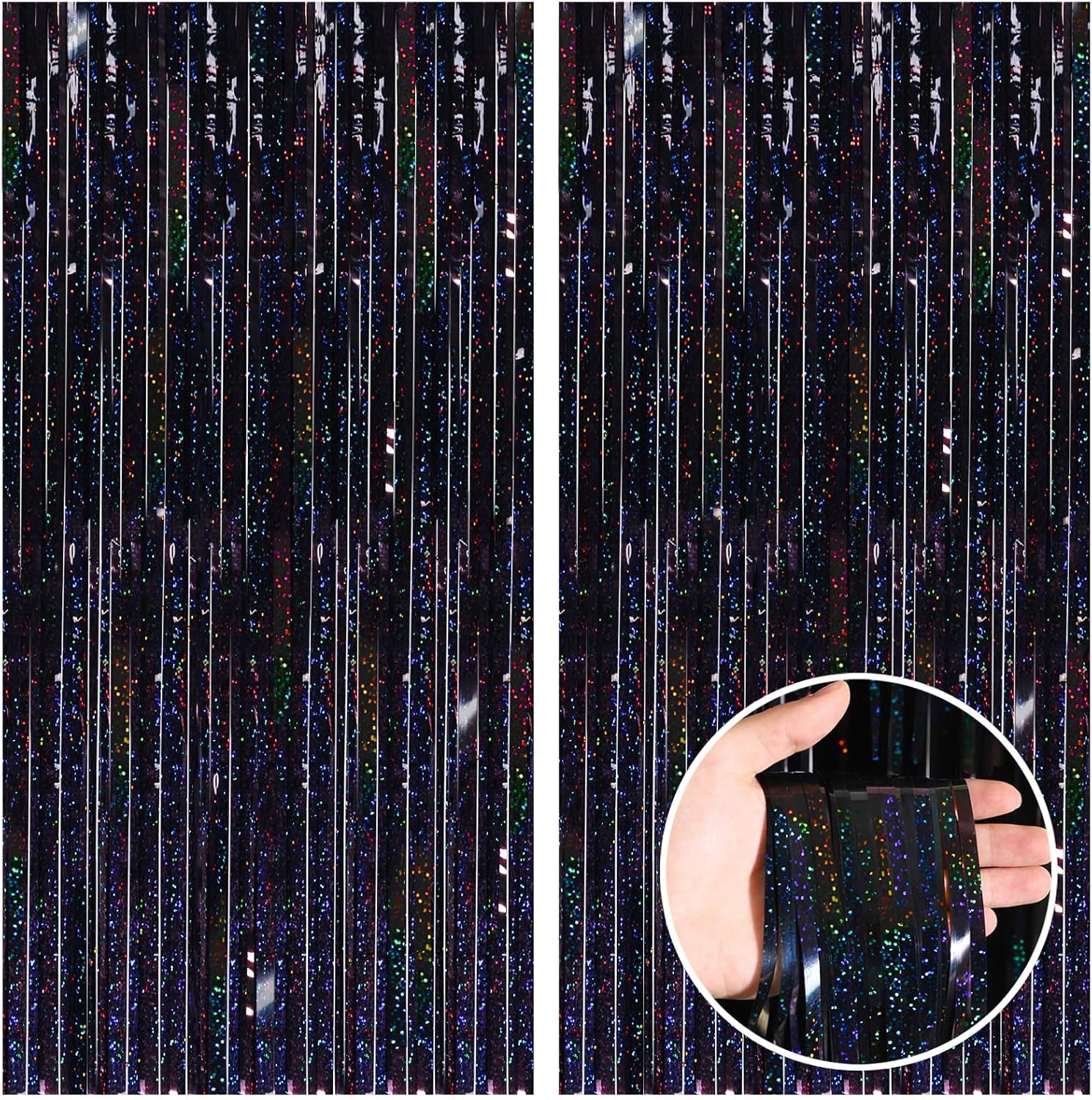 CANREVEL 2 Pack 3.3x8.2 Feet Laser Black Foil Fringe Backdrop Curtains, Tinsel Streamers Birthday Party Decorations, Fringe Backdrop for Graduation, Halloween, Happy New Year, Disco Party